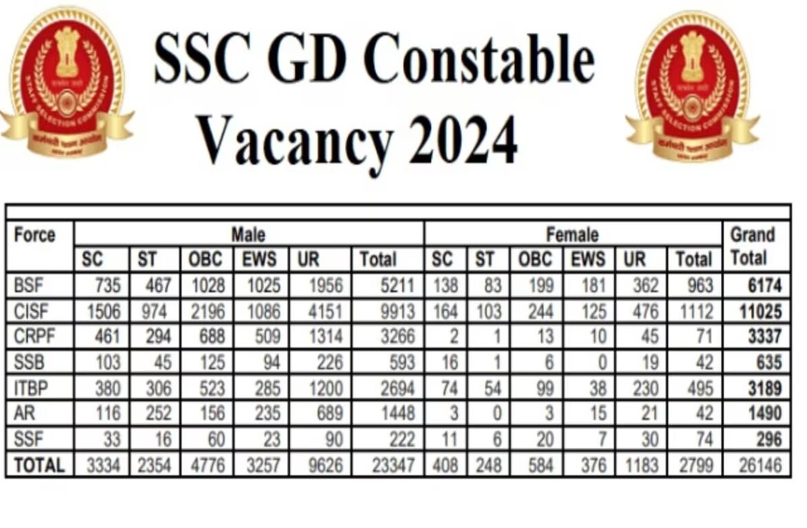 आधिकारिक SSC GD अधिसूचना में एसएससी जीडी कांस्टेबल 2024 परीक्षा के लिए (BSF, CRPF, CISF, ITBP, SSF, SSB, NIA और असम राइफल्स (AR) बलों के लिए रिक्तियों की कुल संख्या 26146 है।