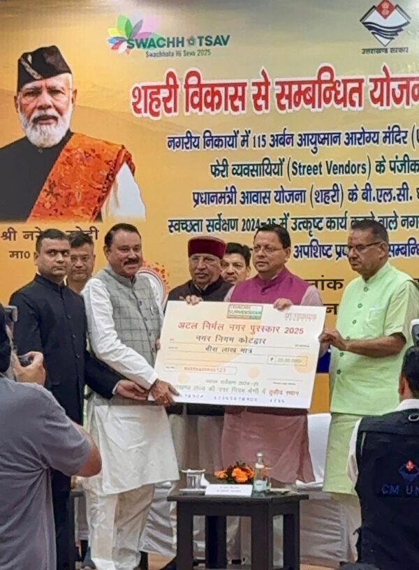 उत्कृष्ट कार्य करने वाले नगर निकायों को प्रदान किए गए ‘अटल निर्मल नगर पुरस्कार 2025’ समारोह में मुख्यमंत्री पुष्कर सिंह धामी ने स्वयं विजेता नगर निगमों को सम्मानित किया। इस प्रतिष्ठित सम्मान समारोह में, रुद्रपुर नगर निगम को प्रथम और पिथौरागढ़ नगर निगम को द्वितीय पुरस्कार से नवाजा गया। कोटद्वार ने तीसरा स्थान प्राप्त कर अपनी स्वच्छता यात्रा में एक महत्वपूर्ण मील का पत्थर स्थापित किया है।