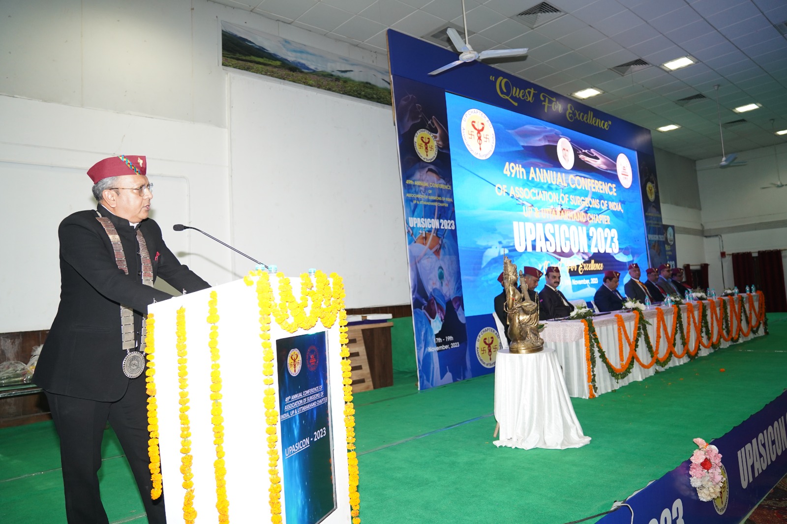 श्री गुरु राम राय मेडिकल काॅलेज के सभागार में यूपीएएसआईकोन-2023 का शुभारंभ सम्मेलन के मुख्य अतिथि एवम् अध्यक्ष, एसोसिएशन ऑफ सर्जनस ऑफ इंडिया डाॅ संजय कुमार जैन, विशिष्ट अतिथि, पूर्व अध्यक्ष एसोसिएशन ऑफ सर्जन्स ऑफ इंडिया डाॅ एस.के.मिश्रा, विशिष्ट अतिथि एवम् अध्यक्ष नेपाल सर्जिकल सोसाइटी डाॅ सुनील कुमार शर्मा, उपाध्यक्ष एसोसिएशन ऑफ सर्जनस ऑफ इंडिया एवम् अध्यक्ष यूपीएएसआई डाॅ प्रोबल नियोगी, पूर्व अध्यक्ष, यूपीएएसआइ एवम् कार्यक्रम के आयोजन सचिव डाॅ जे.पी.शर्मा,