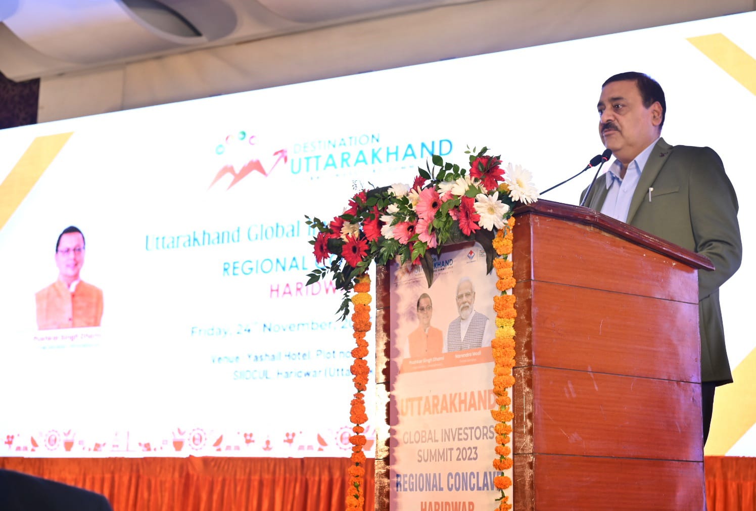 हरिद्वार : मुख्यमंत्री पुष्कर सिंह धामी ने शुक्रवार को होटल यशैल सेण्टर(रेडिशन ब्लू) में ग्लोबल इंवेस्टर्स समिट-2023 के अन्तर्गत क्षेत्रीय निवेश कान्क्लेव में प्रतिभाग किया। इस अवसर पर राज्य में आर्थिक विकास, निवेश प्रोत्साहन व रोजगार के अवसर सृजित किये जाने तथा राष्ट्रीय व अंतरराष्ट्रीय निवेशकों को निवेश हेतु आकर्षित करने के उद्देश्य से 8 व 9 दिसम्बर 2023 को देहरादून में उत्तराखण्ड ग्लोबल इन्वेस्टर समिट 2023 के आयोजन के क्रम में जनपद हरिद्वार व देहरादून को रू0 10000 करोड़ का एम.ओ.यू. हेतु लक्ष्य दिया गया था जिसके सापेक्ष जनपद हरिद्वार एवं जनपद देहरादून में 304 एम.ओ.यू. धनराशि रू0 37820.47 करोड़ के प्रस्ताव हस्ताक्षर किये गये।