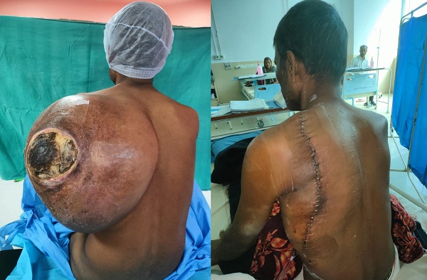 ऋषिकेश : एम्स ऋषिकेश के डाॅक्टरों ने एक मरीज के कन्धे से 45 सेमी लम्बा और करीब साढ़े 6 किलो का ट्यूमर निकालकर सभी को हैरत में डाल दिया है। मरीज अब स्वस्थ है और अस्पताल में स्वास्थ्य लाभ ले रहा है। मरीज का इलाज आयुष्मान योजना के तहत किया गया है। उत्तर प्रदेश के मौहम्मद सादिकपुर के रहने वाले एक 37 वर्षीय मरीज की पीठ के ऊपरी हिस्से तथा कन्धे के निकट एक गांठ (साॅफ्ट टिश्यू सार्कोमा) बन गई थी। धीरे-धीरे कुछ समय बाद इस गांठ में रक्तस्राव के साथ घाव बनने लगा। यह मरीज पहली बार जून 2022 में एम्स अस्पताल आया था लेकिन फॉलोअप में नियमिततौर से एम्स नहीं आ पाया। फिर 2 साल बाद फरवरी 2024 में एम्स की सर्जिकल ऑन्कोलाॅजी विभाग की ओपीडी में आकर मरीज ने अपनी परेशानी बताई। इन 2 वर्षों के दौरान मरीज के कंधे की गांठ का साईज बहुत बढ़ गया और इसकी वजह से उसके हाथ और कंधे ठीक से काम नहीं कर पा रहे थे। बीते माह फरवरी में एम्स पहुंचने पर रोगी ने डाॅक्टरों को बताया कि उसे असहनीय दर्द होता है और उसका हाथ भी नहीं चल रहा है तथा उसकी त्वचा का रंग भी बदल चुका था। डाॅक्टरों ने जांच की तो पता चला कि उसकी पीठ में कैंसर बन चुका है और उसका आकार असामान्य रूप बड़ा हो रहा है।