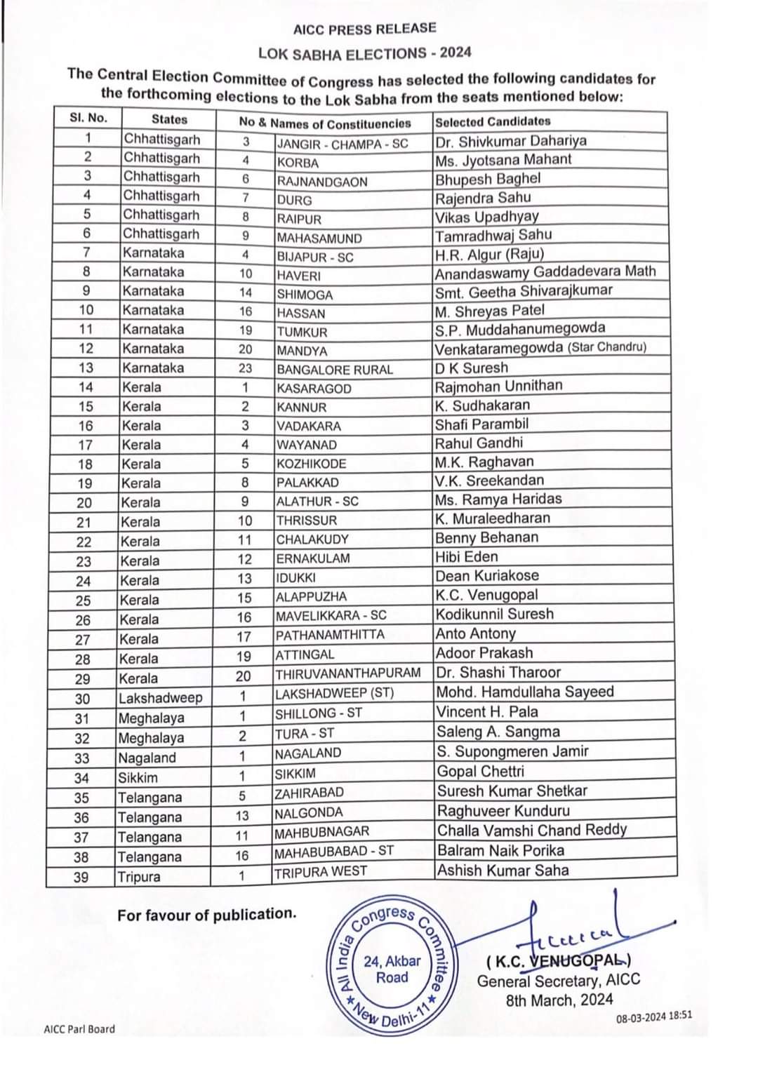 नई दिल्ली : कांग्रेस अध्यक्ष Mallikarjun Kharge की अध्यक्षता में आयोजित ‘केंद्रीय चुनाव समिति’ की बैठक में लोकसभा चुनाव, 2024 के लिए 39 लोकसभा सीटों पर कांग्रेस उम्मीदवारों के नाम घोषित किए गए।
