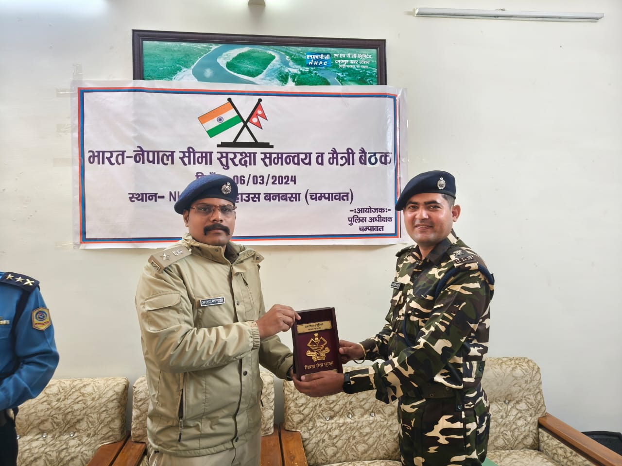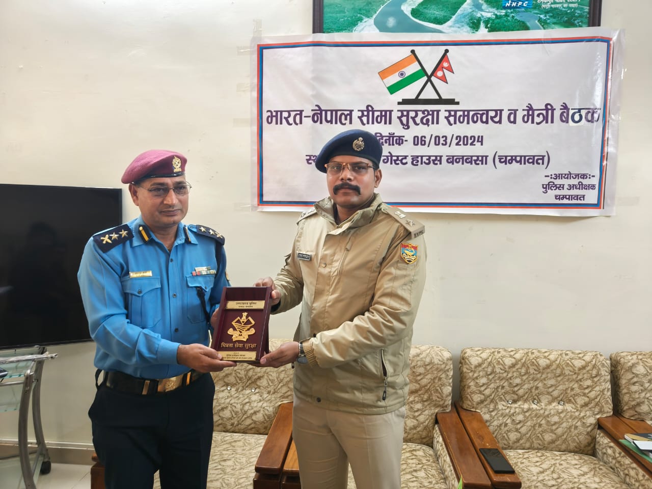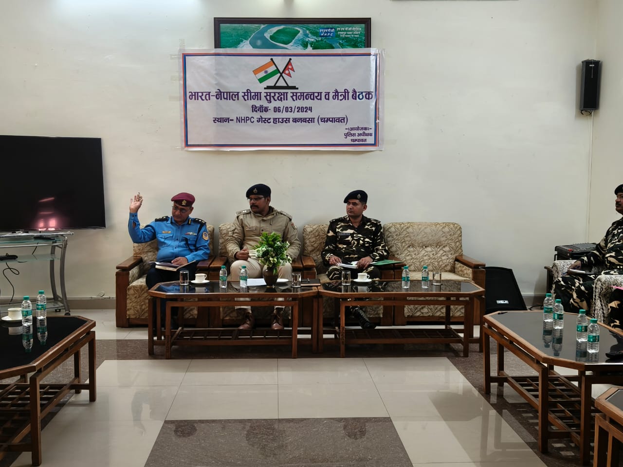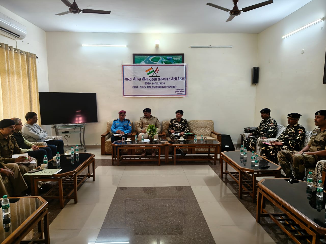 चम्पावत :भारत नेपाल अन्तर्राष्ट्रीय सीमा पर पुलिस अधीक्षक चम्पावत अजय गणपति की अध्यक्षता में की गयी दोनो देशों की सुरक्षा ऐजेन्सियों के साथ भारत-नेपाल सीमा सुरक्षा समन्वय व मैत्री बैठक। दोनो देशों की सुरक्षा ऐजेन्सियों के बीच आपसी समन्वय बनाये जाने व आगामी लोकसभा सामान्य निर्वाचन 2024 को सकुशल सम्पन्न कराये जाने हेतु की गयी बैठक। जनपद चम्पावत के थाना बनबसा क्षेत्रान्तर्गत NHPC गेस्ट हाउस में पुलिस अधीक्षक चम्पावत अजय गणपति की अध्यक्षता में आगामी लोकसभा सामान्य निर्वाचन 2024 के दृष्टिगत जनपद चम्पावत क्षेत्रान्तर्गत लगने वाली भारत-नेपाल अन्तराष्ट्रीय सीमा पर सुरक्षा व्यवस्था बनाये रखने तथा दोनो देशों की सुरक्षा ऐजेन्सियों के साथ आपसी समन्वय बनाये जाने हेतु अन्तराष्ट्रीय सीमा पर नियुक्त दोनो देशो की सुरक्षा ऐजेन्सियों के साथ भारत-नेपाल सीमा सुरक्षा समन्वय व मैत्री बैठक का आयोजन किया गया ।