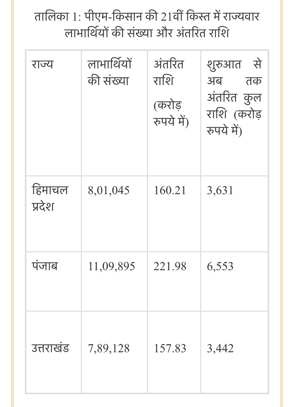 - केंद्रीय कृषि मंत्री ने वीडियो कॉन्फ्रेंसिंग के माध्यम से हिमाचल प्रदेश, पंजाब और उत्तराखंड जैसे वर्षा और बाढ़ प्रभावित राज्यों के किसानों के लिए पीएम-किसान योजना की 21वीं किस्त जारी की