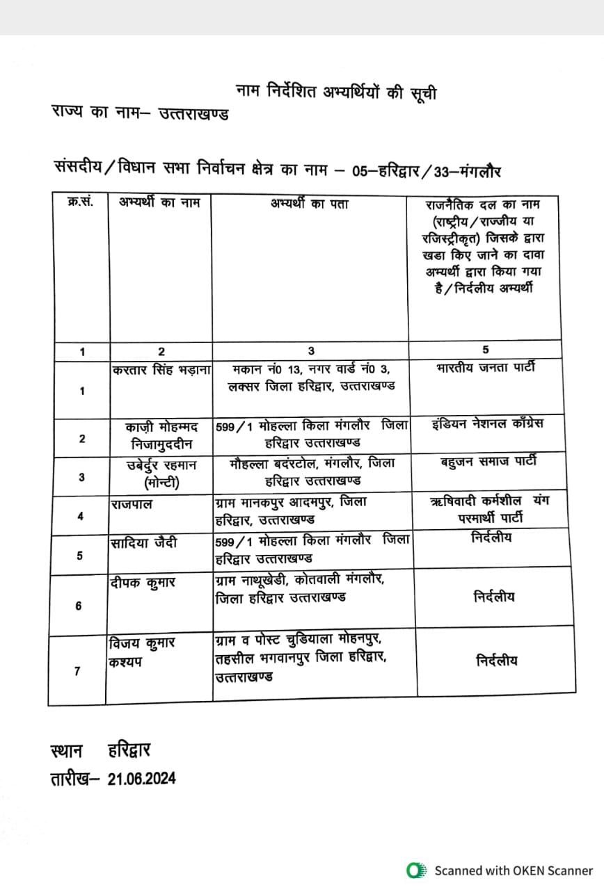 हरिद्वार : मंगलौर विधानसभा उप चुनाव के लिए प्रत्याशियों को लेकर तस्वीर साफ हो गई है। उप चुनाव के लिए कुल 07 प्रत्याशियों ने नामांकन किया है। जिसमें भारतीय जनता पार्टी के उम्मीदवार करतार सिंह भडाना, कांग्रेस पार्टी के उम्मीदवार काज़ी मोहम्मद निजामुद्दीन, बहुजन समाज पार्टी के उम्मीदवार उबेर्दुर रहमान (मोंटी), ऋषिवादी कर्मशील यंग परमार्थी पार्टी के उम्मीदवार राजपाल, निर्दलीय उम्मीदवार सादिया जैदी, निर्दलीय उम्मीदवार दीपक कुमार एवं निर्दलीय उम्मीदवार विजय कुमार कश्यप शामिल है। इस प्रकार मंगलौर विधानसभा उप चुनाव के लिए कुल 07 प्रत्याशियों ने नामांकन किया है। आगामी 24 जून को नाम निर्देशन पत्रों की संवीक्षा की जाएगी और 26 जून तक नाम वापस लिया जा सकता है। उप चुनाव के लिए विधानसभा मंगलौर सीट पर 10 जुलाई को मतदान और 13 जुलाई को मतगणना होनी है।