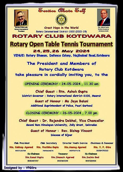 कोटद्वार। रोटरी क्लब कोटद्वार के तत्वावधान में युवा प्रोत्साहन कार्यक्रम के तहत आगामी 24, 25 व 26 मई को होने वाले तीन दिवसीय रोटरी ओपन टेबल टेनिस टूर्नामेन्ट में अब तक लगभग 140  प्रतिभागियों ने भाग लेने की स्वीकृति ली है। यह जानकारी टूर्नामेंट के संयोजक वाईपी गिलरा ने देते हुए बताया कि टूर्नामेंट में देहरादून, ऋषिकेश, हल्द्वानी, नैनीताल, पौड़ी, प्रसुन्डाखाल, थलीसैण, जयहरीखाल, लैन्सडाउन, रिंगवाड़ी, चमोली, कण्वघाटी, कोटड़ीढ़ांग और कोटद्वार के लगभग 140 प्रतिभागियों ने भाग लेने के लिए अपनी सहमति प्रदान की। उन्होंने बताया कि टूर्नामेंट के पहले दिन 24 मई को स्कूल चैंपियनशिप व ओपन, जूनियर बाॅयज सिंगल्स व ओपन सब – जूनियर बाॅयज सिंगल्स के मैच होंगे।