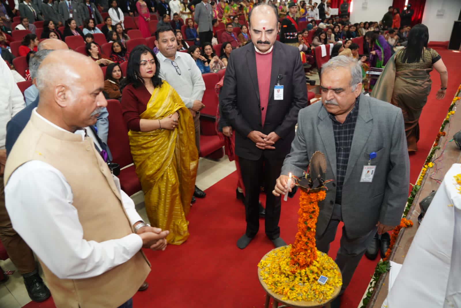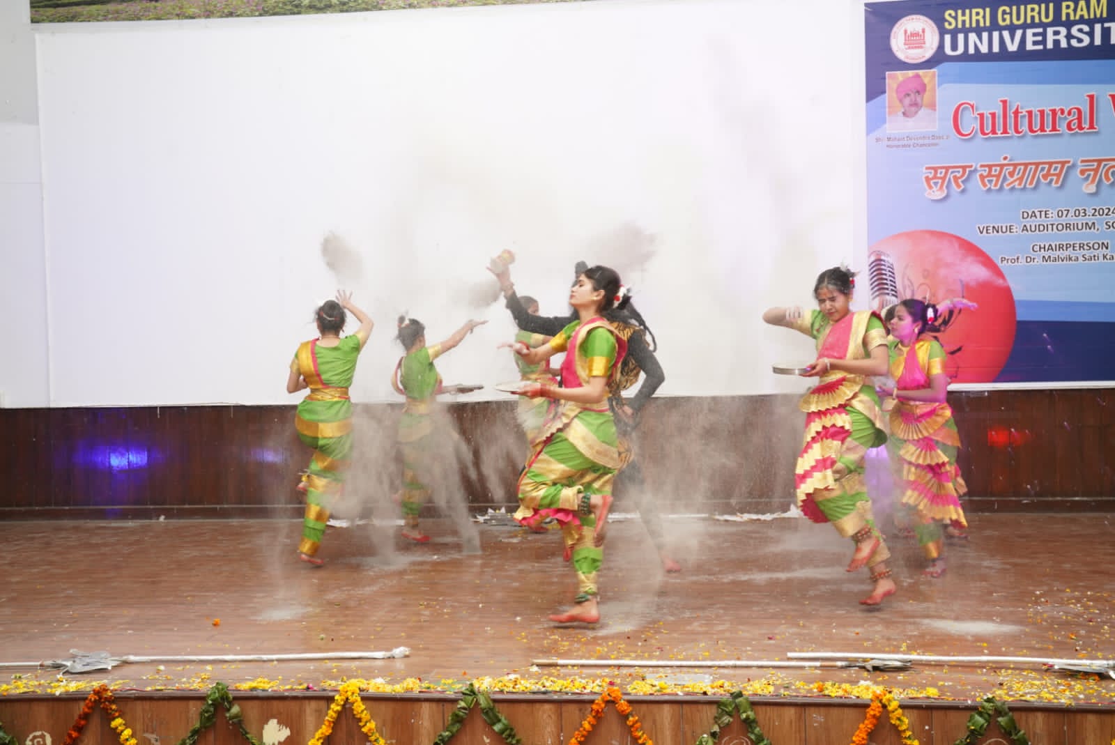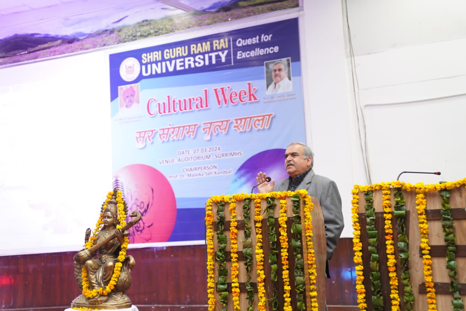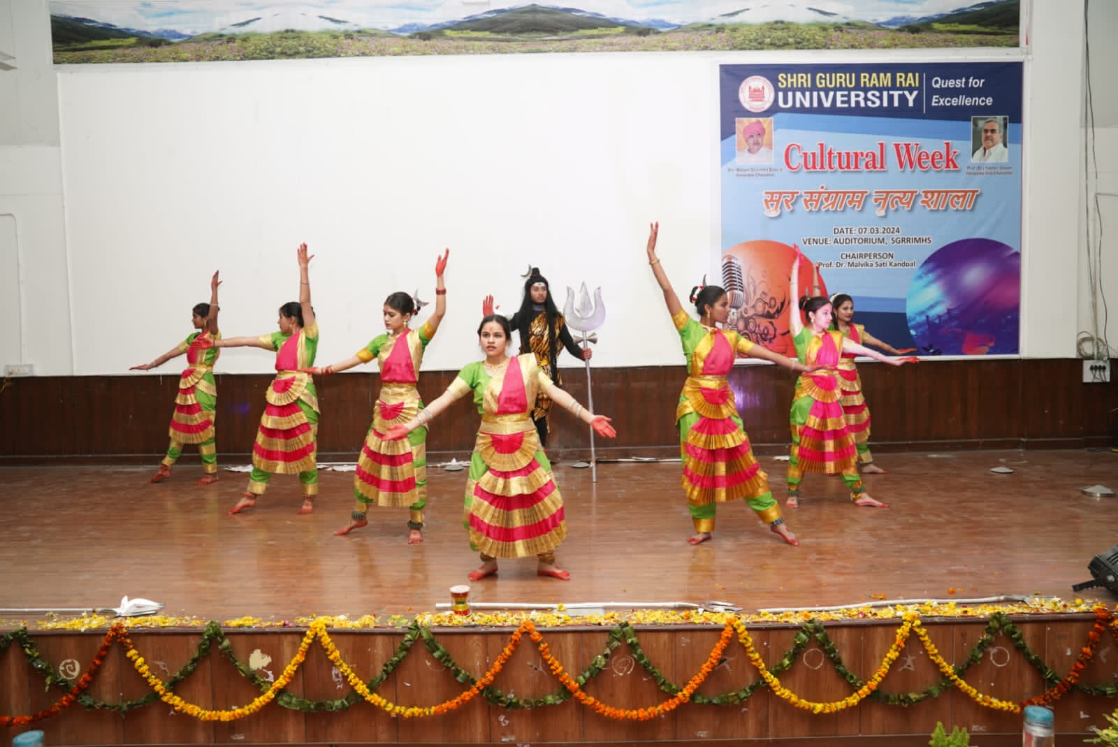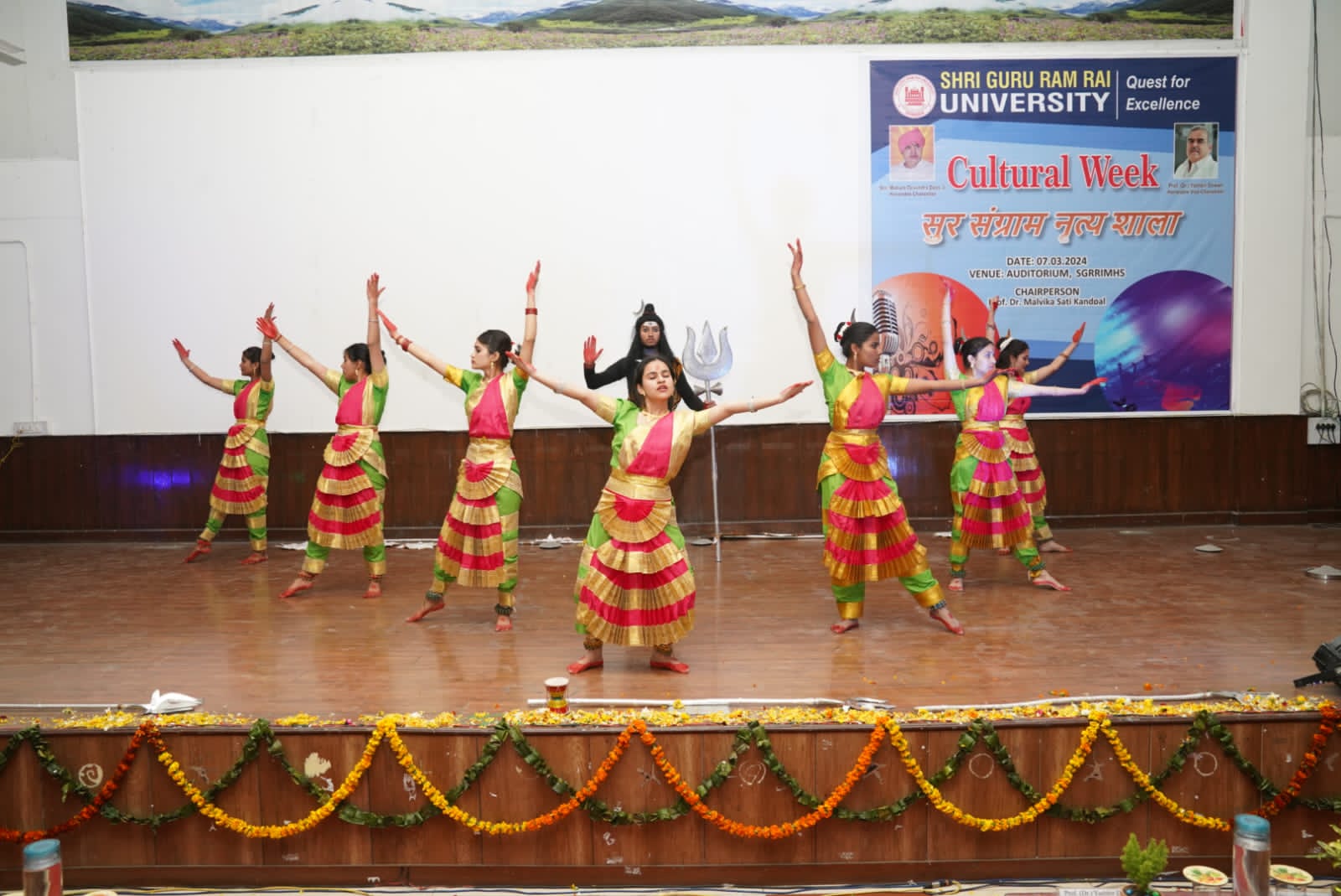 गुरुवार को सुर संग्राम नृत्यशाला के अंतिम दिन का शुभारंभ एसजीआरआर विश्वविद्यालय के कुलपति डाॅ यशबीर दीवान, कुलसचिव डाॅ अजय कुमार खण्डूड़ी एवं कार्यक्रम की चेयरपर्सन डाॅ मालविका कांडपाल ने संयुक्त रूप से दीप प्रज्जवलन कर किया। कुलपति डॉ. यशबीर दीवान ने छात्र छात्राओं की प्रतिभा की तहे दिल से तारीफ की। उन्होंने विशेष रूप से विश्वविद्यालय के एन.सी.सी. केडेट्स एवम प्रोक्टोरियल बोर्ड द्वारा बनाई गई अनुशासन व्यवस्था की भूरी भूरी प्रशंसा की। श्री गुरु राम राय इंस्टीट्यूट आफ मेडिकल एण्ड हैल्थ साइंसेज़ के सभागार में एसजीआरआरयू की छात्राओं ने गणेश वंदना से कार्यक्रम का श्रीगणेश किया।