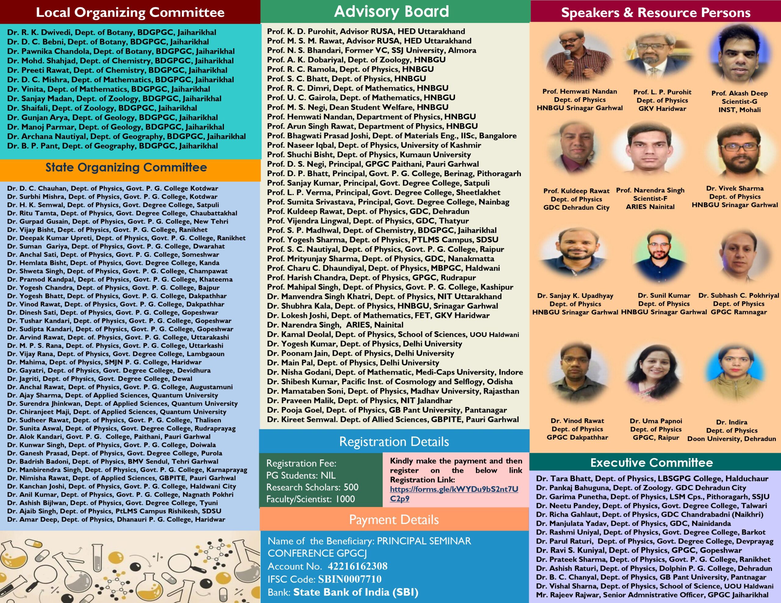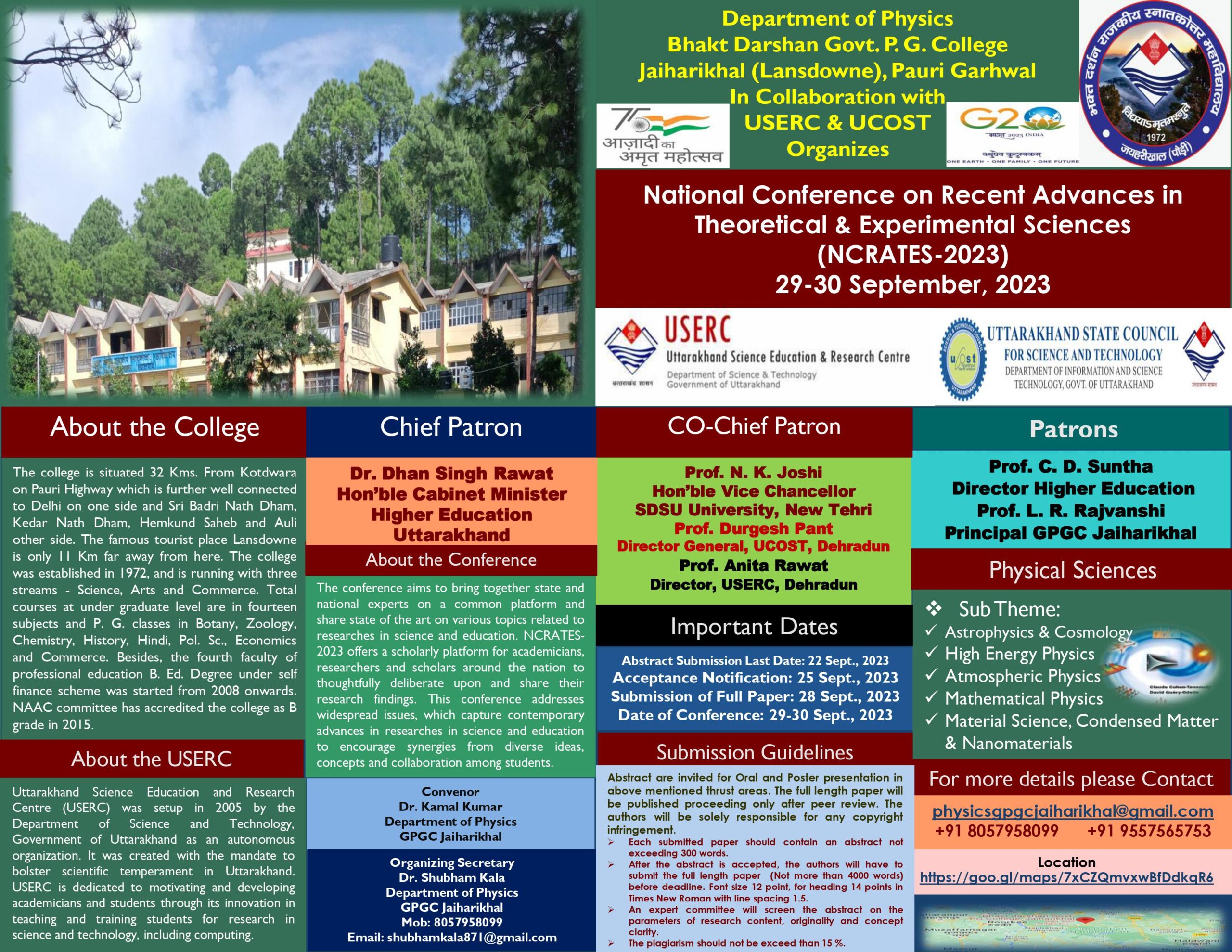 लैंसडाउन : भक्त दर्शन राजकीय स्नातकोत्तर महाविद्यालय जयहरीखाल तथा उत्तराखण्ड विज्ञान एवं शिक्षा अनुसंधान केन्द्र (यूसर्क) के संयुक्त तत्वावधान सैंधांतिक और प्रायोगिक विज्ञान में नवीन हालिया प्रगति विषय पर 29 व 30 सितम्बर को दो दिवसीय राष्ट्रीय संगोष्ठी में देश के विभिन्न शैक्षणिक एवं शोध संस्थानों के वैज्ञानिक ,शोधार्थी एवं प्राध्यापक अपने शोध कार्यों को प्रस्तुत करेंगे। प्राचार्य लवनी आर राजवंशी द्वारा बताया गया कि इस अवसर पर गढ़वाल केन्द्रीय विश्वविध्यालय ,दिल्ली विश्विध्यालय, आईएनएसटी मोहाली चंडीगढ़,यूसर्क,उत्तराखंड अंतरिक्ष अनुप्रयोग केंद्र,वाडिया हिमालयन भूविज्ञान संस्थान तथा आर्यभट्ट प्रेक्षण विज्ञान शोध संस्थान(एरीज) के वरिष्ठ वैज्ञानिक एवं प्रोफेसर मुख्य वक्ता के रूप में अपने व्याख्यान प्रस्तुत करेंगे। भौतिक विज्ञान के विभागध्यक्ष डॉ कमल कुमार और सहायक प्राध्यापक भौतिक विज्ञान डॉ शुभम काला के द्वारा बताया गया कि यह संगोष्ठी चार तकनीकी सत्रों में संपन्न होगी l जिसमें मुख्यत:भौतिकी, रसायन,गणित एवं पर्यावरण विज्ञान सम्मिलित है। कांफ्रेंस में उत्कृष्ट शोध प्रस्तुत करने वाले शोधार्थी को युवा वैज्ञानिक पुरस्कार प्रदत्त किया जाएगा।
