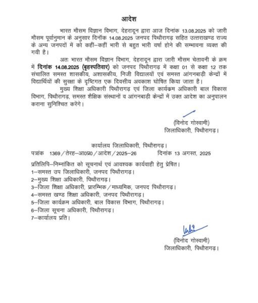 मौसम विभाग, देहरादून द्वारा जारी भारी वर्षा की संभावना के दृष्टिगत कल बृहस्पतिवार अर्थात 14 अगस्त को जनपद पिथौरागढ़ में कक्षा 1 से 12 तक के समस्त स्कूलों के साथ साथ सभी आंगनबाड़ी केंद्रों में एक दिन का अवकाश घोषित किया गया है।