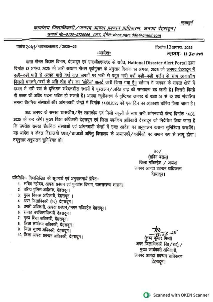 देहरादून : मौसम विभाग और नेशनल डिजास्टर अलर्ट पोर्टल की चेतावनी के बाद जिला प्रशासन ने देहरादून समेत पांच जिलों में 14 अगस्त को सभी स्कूलों और आंगनबाड़ी केंद्रों में अवकाश घोषित कर दिया है। यह आदेश सरकारी, गैर-सरकारी, निजी स्कूलों और सभी शिक्षण संस्थानों पर समान रूप से लागू होगा।