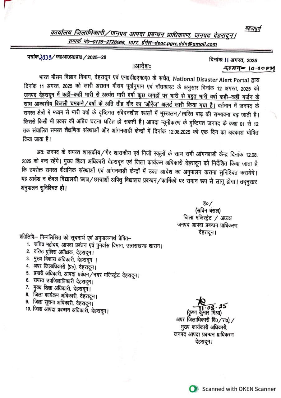देहरादून : जिलाधिकारी देहरादून सविन बंसल ने अवगत कराया है कि भारत मौसम विज्ञान विभाग, देहरादून एवं एनडीएमए के सचेत, National Disaster Alert Portal द्वारा 12 अगस्त, 2025 हेतु जारी अद्यतन मौसम नॉउकास्ट के अनुसार 12 अगस्त, 2025 को जनपद देहरादून में कहीं-कहीं भारी से अत्यंत भारी वर्षा कुछ जगहों पर भारी से बहुत भारी वर्षा कही-कहीं गर्जन के साथ आकाशीय बिजली चमकने/वर्षा के अति तीव्र दौर का “औरेंज” अलर्ट जारी किया गया है। वर्तमान में जनपद के समस्त क्षेत्रों में मध्यम से भारी वर्षा के दृष्टिगत संवेदनशील स्थलों में भूस्खलन / त्वरित बाढ़ की सम्भावना बढ़ जाती है। जिससे किसी भी प्रकार की अप्रिय घटना घटित हो सकती है। आपदा न्यूनीकरण के दृष्टिगत जनपद के कक्षा 01 से 12 तक संचालित समस्त शैक्षणिक संस्थाओं और आंगनबाडी केन्द्रों में दिनांक 12 अगस्त 2025 को एक दिन का अवकाश घोषित किया जात है।