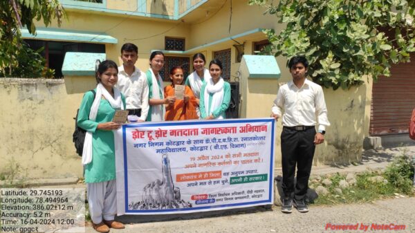 कोटद्वार । नगर निगम कोटद्वार ने आगामी 19 अप्रैल को होने वाले लोकसभा चुनाव में आम जनमानस में वोट देने तथा बढ़ – चढ़ के भाग लेने हेतु राजकीय स्नातकोत्तर महाविद्यालय के बीएड विभाग के साथ मिलकर डोर टू डोर दो दिवसीय मतदाता जागरूकता अभियान चलाया । जिसमें बीएड के छात्र छात्राओं ने बढ़ – चढ़ कर भाग लिया तथा नगर निगम के समस्त वार्डो में घूम-घूम कर लोगों को मतदान के महत्व को बताया व आगामी चुनाव में अपने मत का प्रयोग कर सही व योग्य जनप्रतिनिधि को चुनने के लिए प्रेरित किया । महाविद्यालय की प्राचार्य प्रोफेसर जानकी पंवार ने बीएड के प्रशिक्षणार्थियों को कार्यक्रम की सफलता के लिए बधाई व शुभकामनाएं दी ।