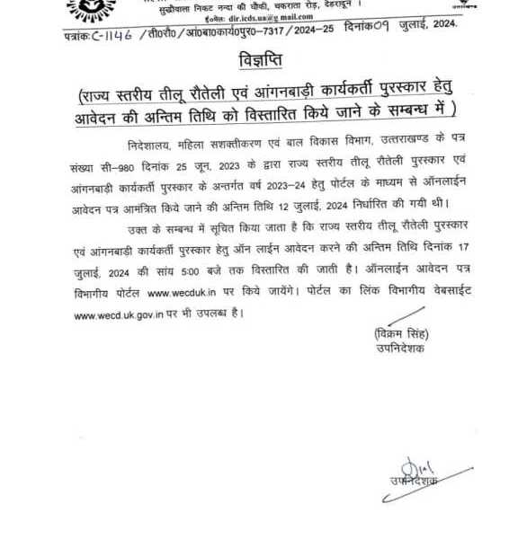 रुद्रप्रयाग : जिला कार्यक्रम अधिकारी अखिलेश मिश्र ने जानकारी देते हुए अवगत कराया है कि तीलू रौतेली पुरस्कार के लिए आवेदन तिथि की समय सीमा बढ़ाते हुए अब 17 जुलाई, 2024 तक कर दी गई है। उन्होंने कहा कि इससे पूर्व अंतिम तिथि 12 जुलाई, 2024 निर्धारित की गई थी। उन्होंने बताया कि महिलाओं को सशक्त बनाने के लिए हर वर्ष यह पुरस्कार दिया जाता है। इससे पूर्व राज्य स्तरीय तीलू रौतेली पुरस्कार एवं आंगनबाड़ी कार्यकत्री पुरस्कार के लिए वर्ष 2023-24 हेतु पोर्टल के माध्यम से ऑनलाईन आवेदन पत्र आमंत्रित किए जाने की अन्तिम तिथि 12 जुलाई, 2024 निर्धारित की गयी थी। उन्होंने बताया कि इस संबंध में राज्य स्तरीय तीलू रौतेली पुरस्कार एवं आंगनबाड़ी कार्यकत्री पुरस्कार हेतु ऑन लाईन आवेदन करने की अन्तिम तिथि दिनांक 17 जुलाई, 2024 की सांय 5ः00 बजे तक कर दी गई है। ऑनलाईन आवेदन पत्र विभागीय पोर्टल www.wecd.in पर किए जाएंगे। पोर्टल का लिंक विभागीय वेबसाईट www.wecd.uk.gov.in पर भी उपलब्ध है।