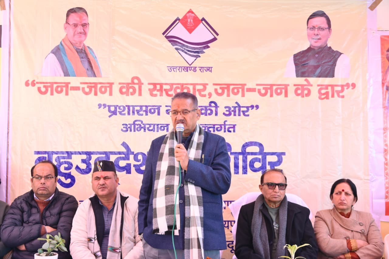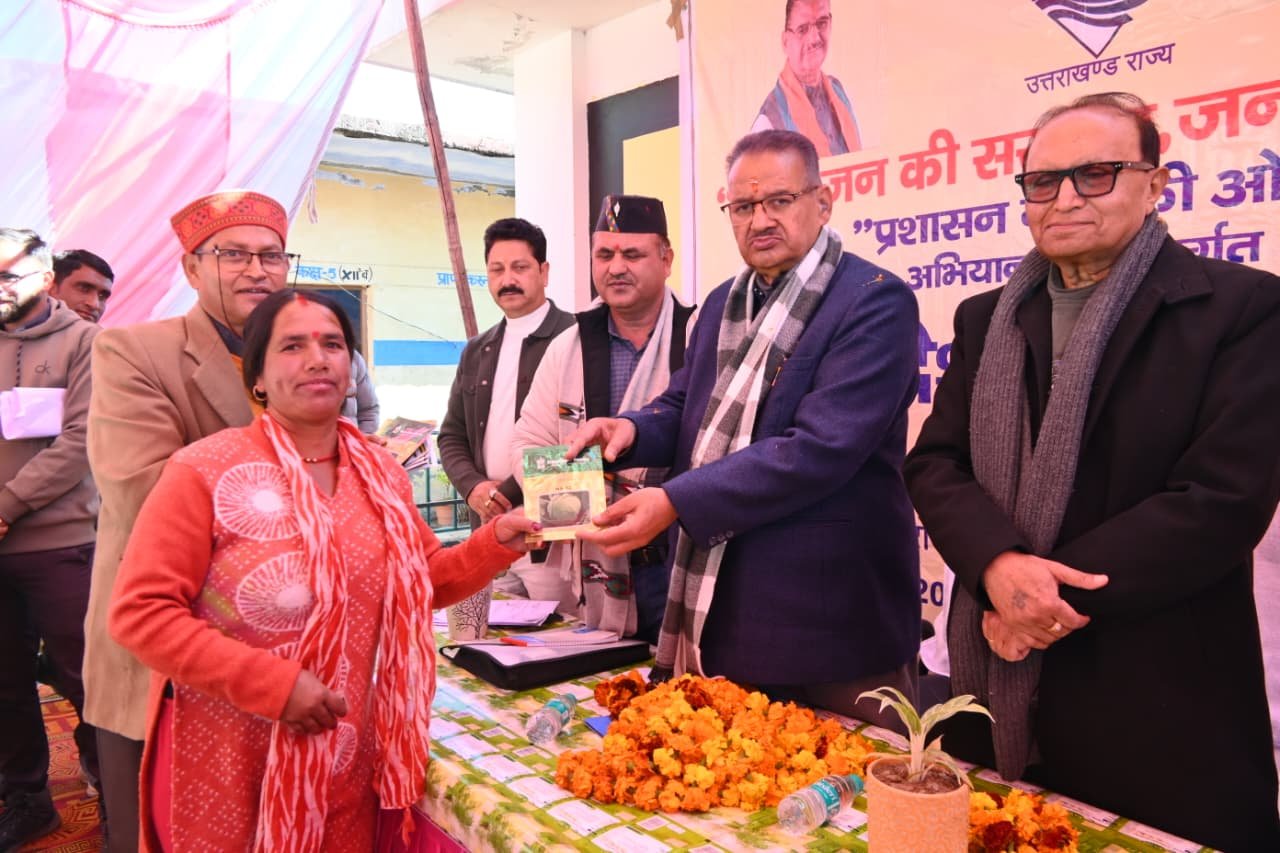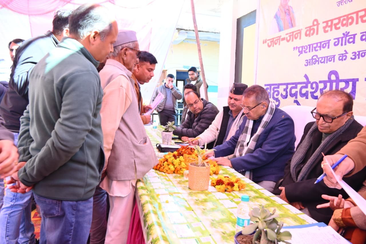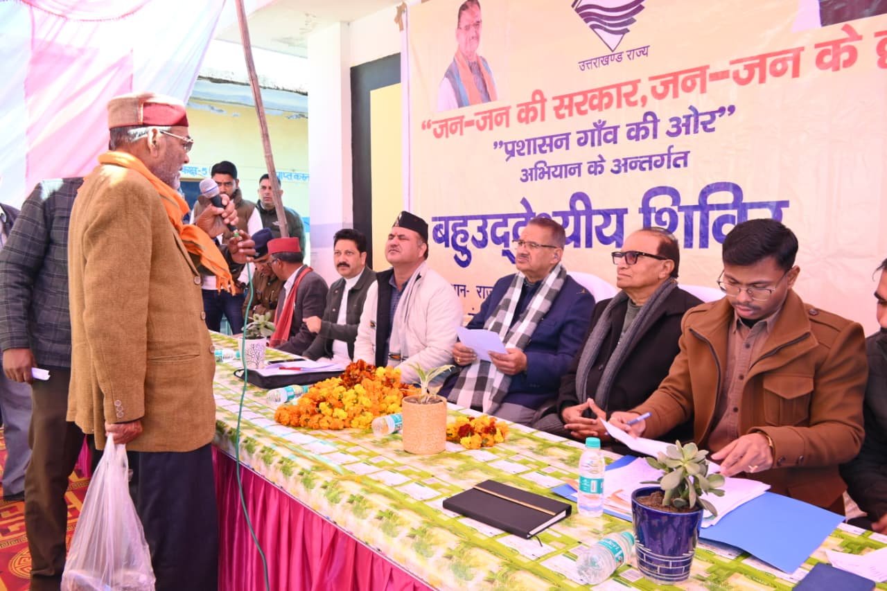 इस अवसर पर कैबिनेट मंत्री गणेश जोशी ने विभिन्न विभागों द्वारा लगाए गए स्टालों का निरीक्षण किया। महिला सशक्तिकरण एवं बाल विकास विभाग द्वारा तीन महिलाओं को मुख्यमंत्री महालक्ष्मी किट तथा 10 लाभार्थियों को बेबी किट वितरित की गई। साथ ही, विभिन्न विभागों द्वारा ग्रामीणों को जनकल्याणकारी योजनाओं की जानकारी प्रदान की गई। संयुक्त मजिस्ट्रेट ने कहा कि जनता की समस्याओं का त्वरित समाधान करना प्रशासन की सर्वोच्च प्राथमिकता है। उन्होंने संबंधित विभागों को निर्देश दिए कि प्राप्त शिकायतों का समयबद्ध एवं प्रभावी निस्तारण सुनिश्चित किया जाए। शिविर में कृषि विभाग द्वारा 80ः सब्सिडी पर 6 पावर वीडर एक स्प्रे मशीन कृषकों को उपलब्ध करायी गई, वहीं शिविर में चार दिव्यांग प्रमाण पत्र, 07 आयुष्मान कार्ड भी मौके पर निर्गत किए गए।