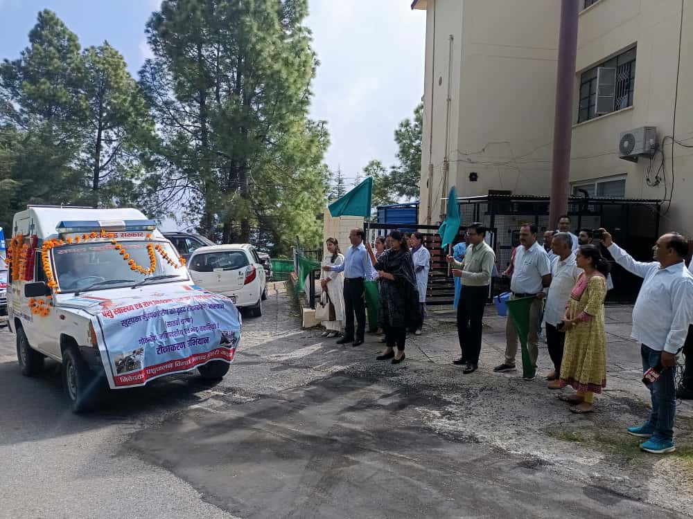 टिहरी : जनपद टिहरी गढ़वाल में खुरपका–मुंहपका बीमारी की रोकथाम हेतु 7वीं चरण के टीकाकरण अभियान का शुभारम्भ टिहरी गढ़वाल मुख्य विकास अधिकारी वरुणा अग्रवाल द्वारा किया गया। मुख्य विकास अधिकारी ने MVU सचल पशु चिकित्सा वाहनों को टीकाकरण हेतु हरी झण्डी दिखाकर रवाना किया और पशु चिकित्सा विभाग के समस्त उपस्थित लोगों को शुभकामनाएं दी एवं प्रेरित किया कि जनपद से कोई पशु टीकाकरण से वंचित ना रहे।