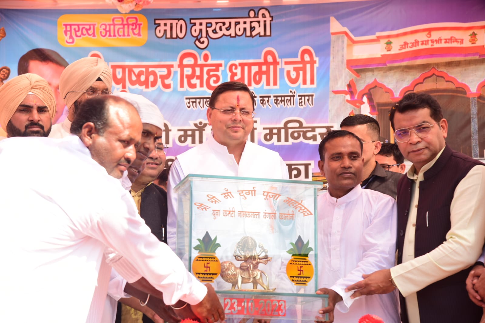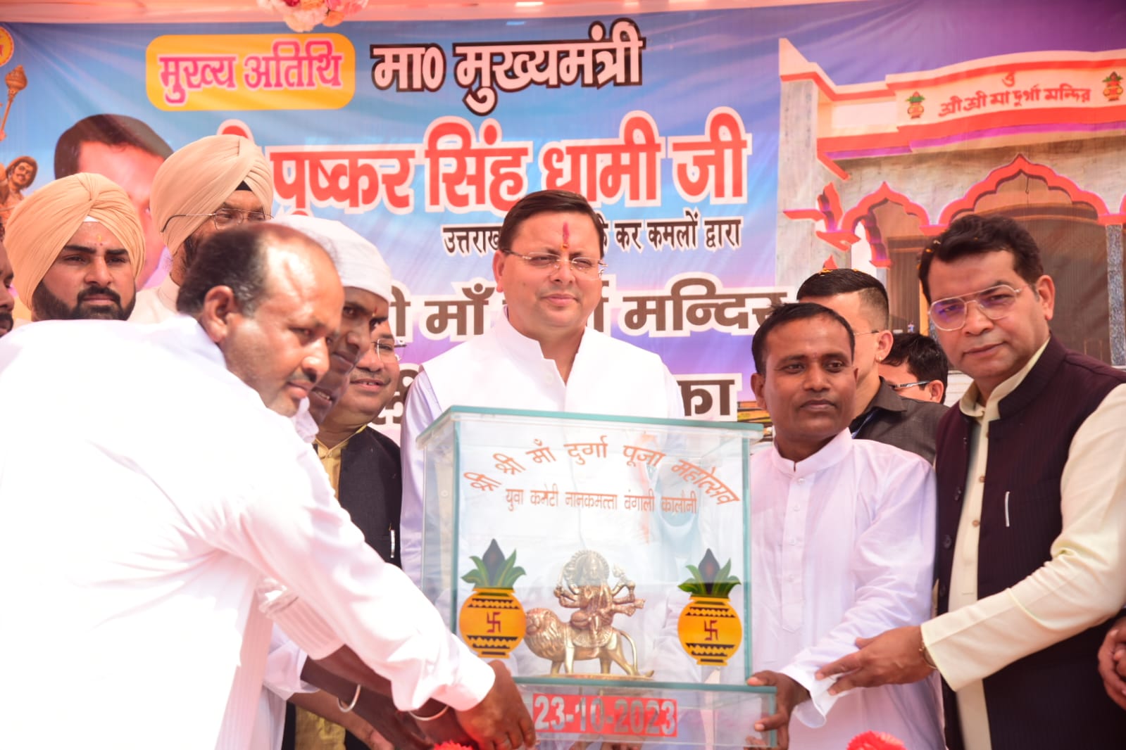 नानकमत्ता /देहरादून : मुख्यमंत्री पुष्कर सिंह धामी ने बंगाली कॉलोनी, नानकमत्ता पहुंचकर श्री श्री मां दुर्गा मंदिर का लोकार्पण किया इस अवसर पर मुख्यमंत्री ने मंदिर के सौंदर्यीकरण, नानकमत्ता क्षेत्र के विकास हेतु मिनी मास्टर प्लान बनाने की भी घोषणा की। मन्दिर परिसर पहुँचने पर क्षेत्रवासियों ने मुख्यमंत्री पुष्कर सिंह धामी को स्मृति स्वरूप दुर्गा माता की प्रतिमा भेंट की।