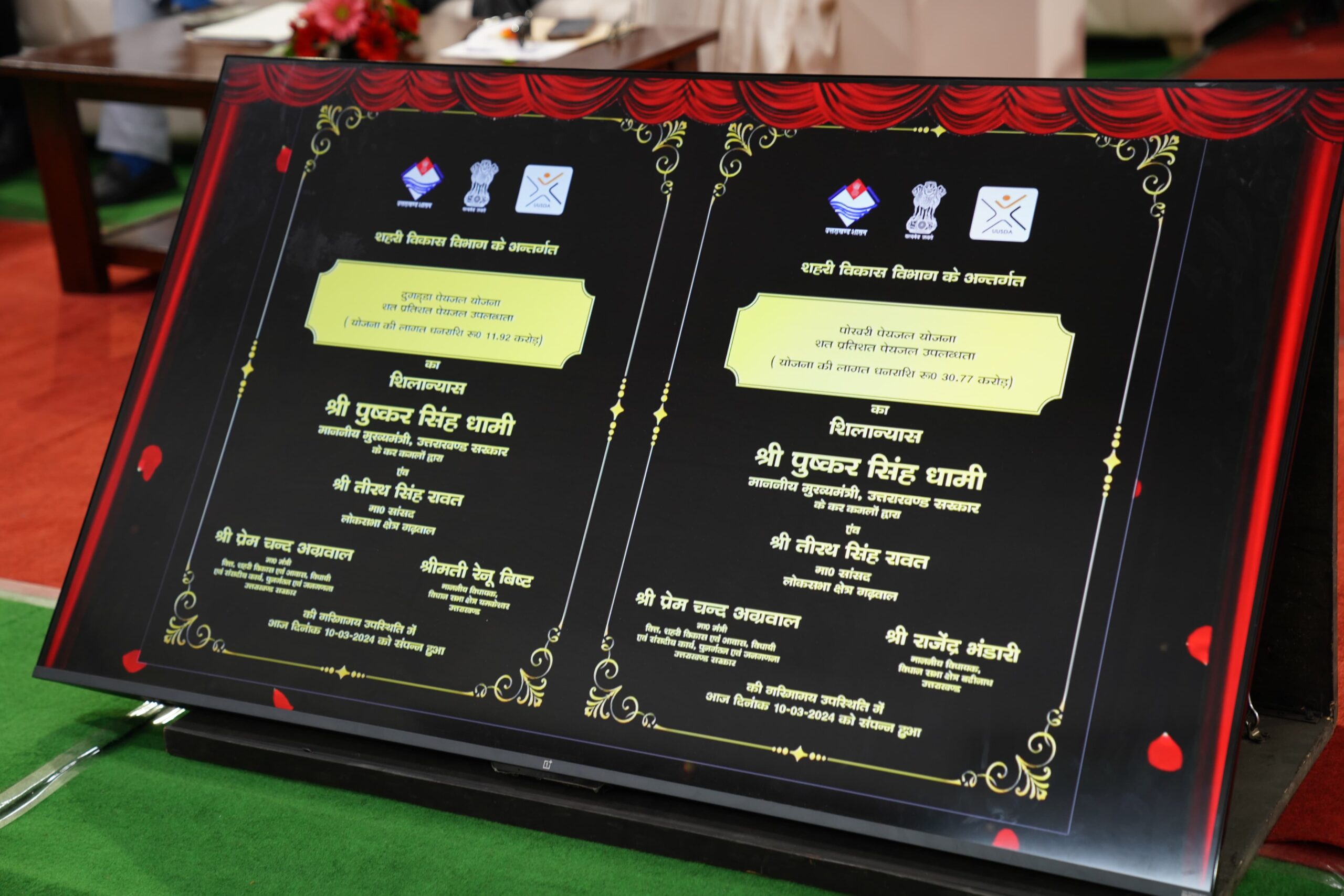 जनपद पिथौरागढ़ के विकास खण्ड धारचूला में काली नदी के दाँये पार्श्व पर स्थित घटगाड़ नाले से टैक्सी स्टैण्ड तक तटबन्ध सुदृढ़ीकरण की योजना (भाग-2 एवं भाग-3)। मा. मुख्यमंत्री घोषणा संख्या-64/2019) – रु. 91.83 करोड़ । नमामि गंगे कार्यक्रम के अन्तर्गत रिस्पना एवं बिन्दाल नदी में आई.एण्ड.डी. कार्य (केन्द्र पोषित) – 67.39 करोड़। ऋषिकेश देहात पम्पिंग पेयजल योजना (बाह्य सहायतित) – रु. 65.55 करोड़। जीवनगढ़ पम्पिंगं पेयजल योजना (बाह्य सहायतित) – रु. 60.56 करोड़। नथनपुर पम्पिंगं पेयजल योजना (बाह्य सहायतित) – रु. 66.61 करोड़। ढ़ालीपुर जल विद्युत परियोजना (3ग17 मे.वा. का नवीनीकरण एवं आधुनिकीकरण)- रु. 152.65 करोड़