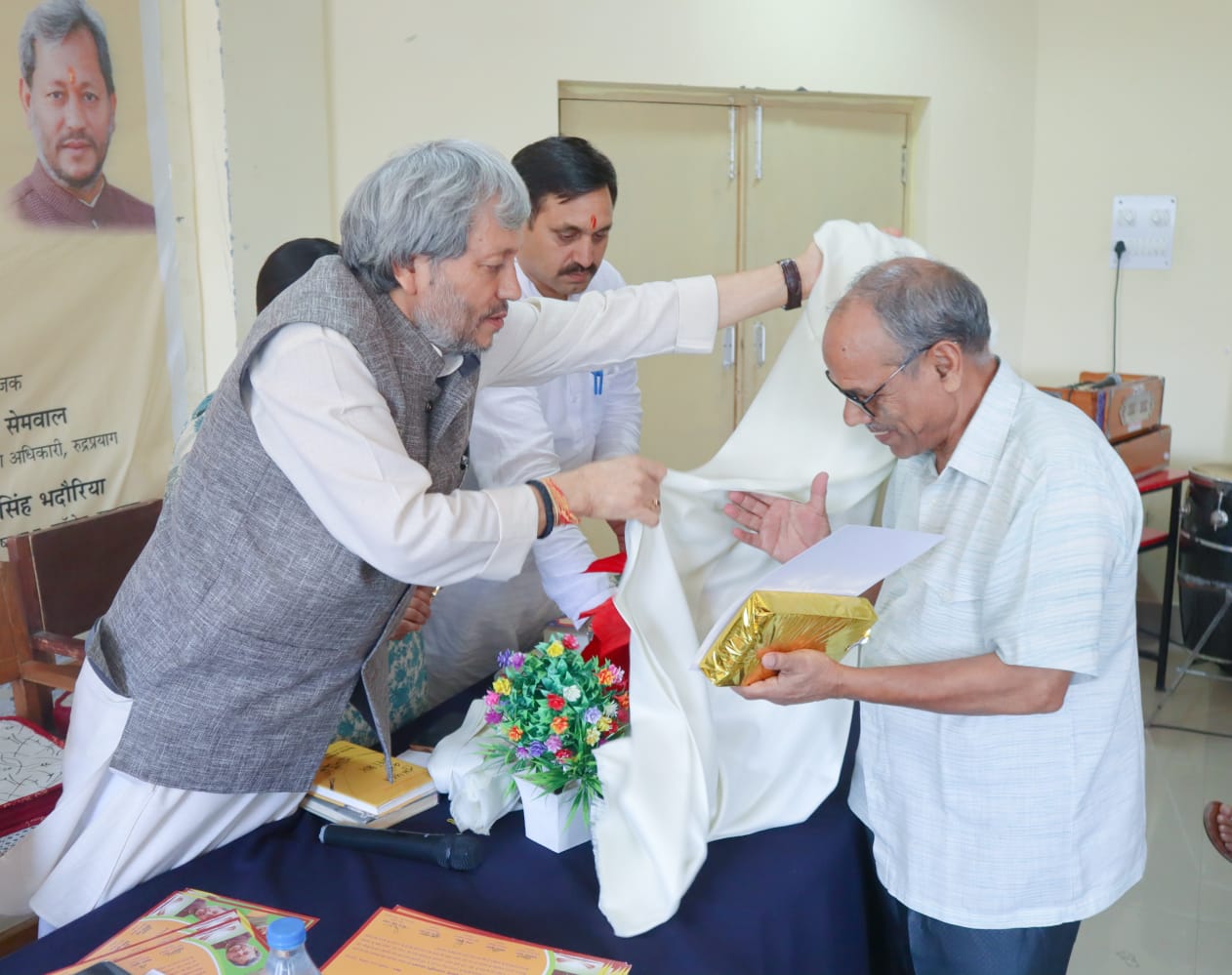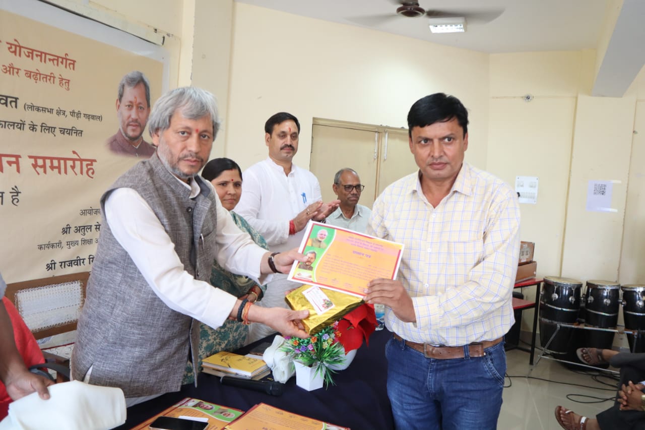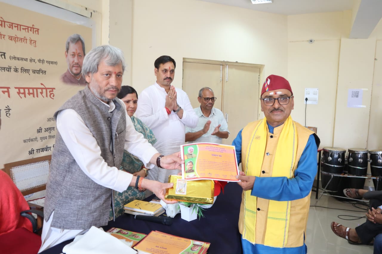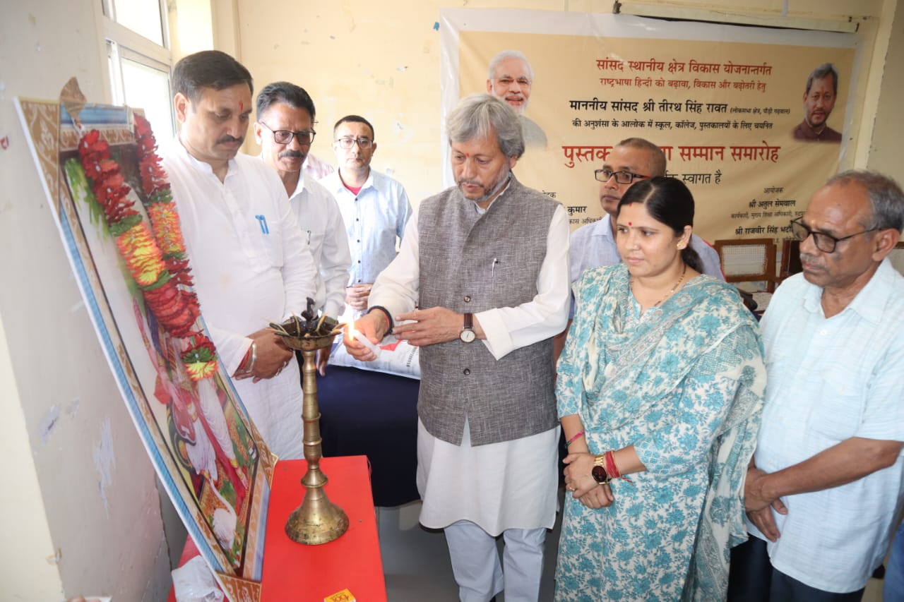 राजकीय इंटर कॉलेज रूद्रप्रयाग में आयोजित पुस्तक वितरण एवं सम्मान समारोह का उद्घाटन सांसद तीरथ सिंह रावत, जिला पंचायत अध्यक्ष अमरदेई शाह, भाजपा जिलाध्यक्ष महावीर सिंह पंवार, परियोजना निदेशक विमल कुमार, विद्यालय के प्रधानाचार्य राजबीर सिंह भदौरिया समेत अन्य लोगों ने दीप प्रज्वलित कर किया। जिसके बाद विद्यालय की छात्राओं ने स्वागत गीत की प्रस्तुति दी। सांसद तीरथ सिंह रावत ने जनपदभर से पहुंचे प्रधानाचार्यों, प्रधानाध्यापक एवं शिक्षकों का स्वागत करते हुए कहा कि अपनी भाषा एवं बोली के उत्थान एवं प्रचार के लिए सामूहिक और सतत प्रयास होने जरूरी हैं। हम औपनिवेषिक काल के बाद से अपनी पहचान एवं संस्कृति को अपनाने एवं स्वीकारने में पिछड़ते जा रहे हैं। यह सोच बदलनी होगी, अपनी मूल संस्कृति, भाषा- बोलियों को हमेशा जीवित रखने एवं नई पीढ़ी तक पहुंचाने की जिम्मेदारी हम सब को उठानी होगी।