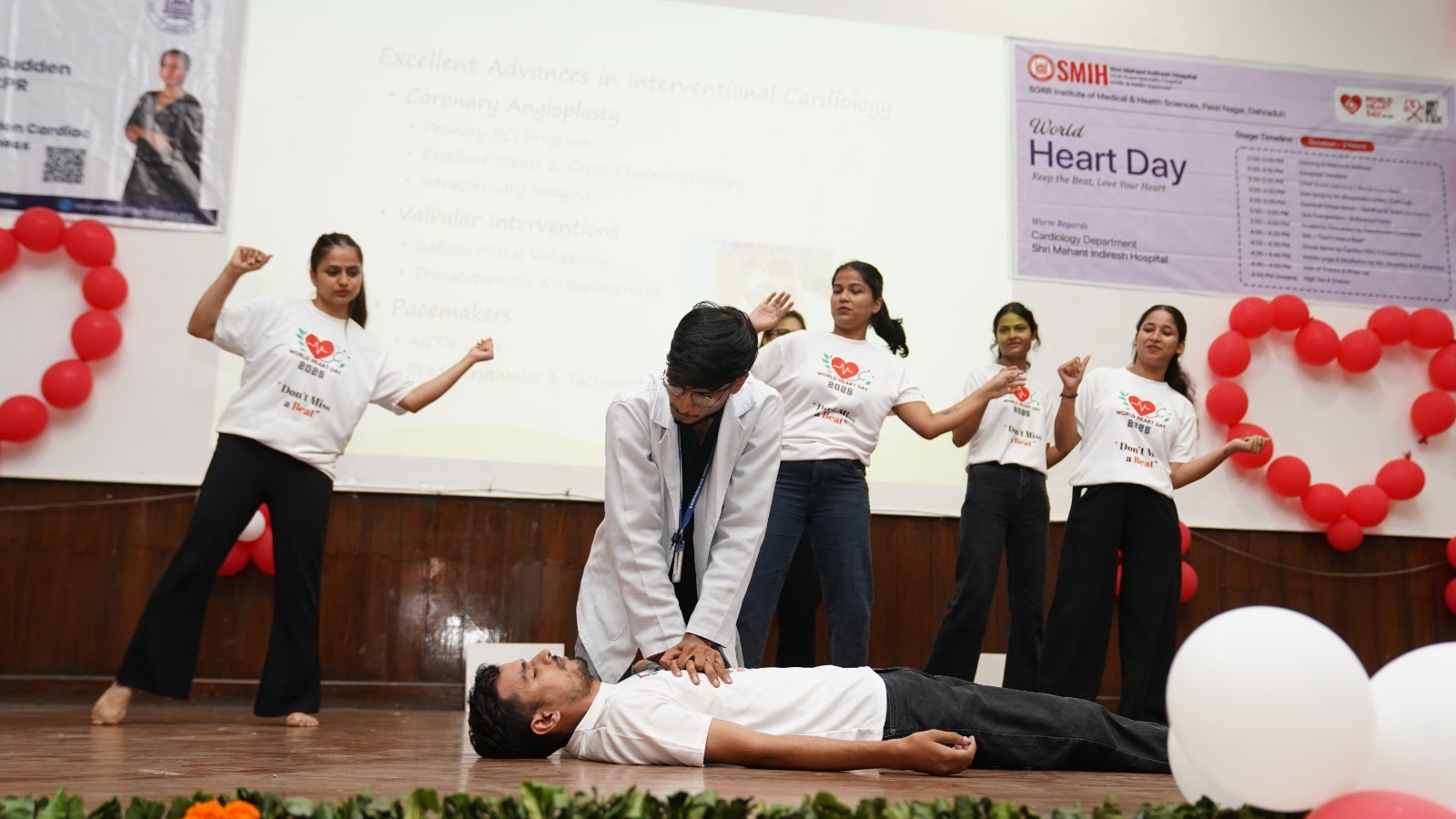 श्री गुरु राम राय इस्टीट्यूट ऑफ मेडिकल एण्ड हैल्थ साइसेज के निदेशक डाॅ. मनोज गुप्ता, प्राचार्य डाॅ. अशोक नायक, श्री महंत इन्दिरेश अस्पताल के चिकित्सा अधीक्षक डाॅ. गौरव रतूड़ी के द्वारा संयुक्त रूप से दीप प्रज्जवलित कर किया। इसके बाद कैथलैब स्टाफ भूपेन्द्र लिंबू गिटारिस्ट के द्वारा गिटार की धुन पर सुरमयी गीत गा कर सभी प्रतिभागियो को मंत्रमुक्त किया। सीसीयू एवं डे केयर स्टाफ सध्या व टीम ने गढवाली गीतो की धुन पर समूह नृत्य पेश किया गया। इसके उपरांत रिवाइव हार्ट फाउण्डेशन द्वारा डिजाइन की गई क्लीनिकल कोशियन्स इन कार्डियोलाॅजी विषयक प्रश्नोत्तरी प्रतियोगिता को प्रो डाॅ. तनुज भाटिया द्वारा आयोजित किया गया जिसमें प्रतिभागियो का हृदय रोगो के संबध में ज्ञानवर्धन किया गया। मानव पुतला (मैनीक्वन) के माध्यम से हृदय रोग विशेषज्ञो ने मरीज को सीपीआर देकर आपातकाल में जीवन बचाना सिखाया गया। कार्डिक एचडीयू स्टाफ द्वारा समूह नृत्य कर समा बाधा गया। आर्टिस्टीक योगा को व्यवहारिक रूप से 13 वर्षीय बालिका अनुष्का जोशी द्वारा किया व समझाया गया। डाॅ. अनामिका द्वारा योग व ध्यान के विषय में ज्ञानवर्धन किया गया। प्रो डाॅ. तनुज भाटिया द्वारा कार्यक्रम मे अंत मे धन्यवाद ज्ञापन दिया गया।