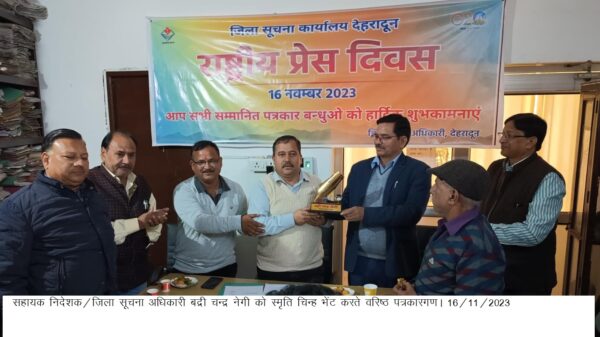 देहरादून : भारतीय प्रेस परिषद नई दिल्ली के निर्देशों के क्रम में ‘‘राष्ट्रीय प्रेस दिवस के अवसर 16 नवम्बर 2023 को ‘‘ कृत्रिम मेधा’’ (आर्टिफिशियल इंटेलिजेंस) के युग में मीडिया’’ विषय पर सहायक निदेशक/ जिला सूचना अधिकारी बद्री चन्द्र नेगी ने गणमान्य सम्मानित पत्रकारों की उपस्थिति में जिला सूचना कार्यालय गोष्ठी का आयोजन किया गया। गोष्ठी में उपस्थित पत्रकारगणों ने क्रमवार अपने-अपने विचार रखे।