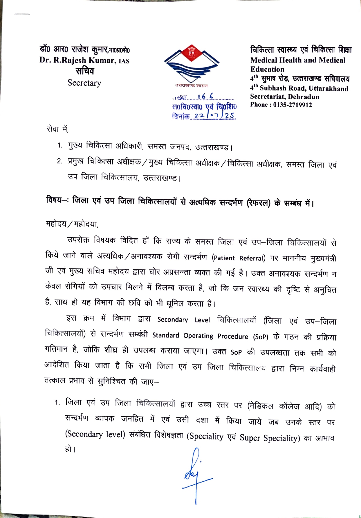 देहरादून : मुख्यमंत्री पुष्कर सिंह धामी के निर्देश पर उत्तराखंड शासन ने सरकारी अस्पतालों में मरीजों के अनावश्यक रेफरल पर सख्ती बरतनी शुरू कर दी है। स्वास्थ्य सचिव डॉ. आर. राजेश कुमार ने स्पष्ट किया है कि अब बिना ठोस चिकित्सकीय कारण के किसी भी रोगी को जिला और उप-जिला अस्पतालों से उच्च संस्थानों जैसे मेडिकल कॉलेजों या बड़े अस्पतालों को रेफर नहीं किया जाएगा। स्वास्थ्य सचिव ने बताया कि मुख्यमंत्री जी के निर्देशों के क्रम में यह सुनिश्चित किया जा रहा है कि प्रत्येक मरीज को प्राथमिक उपचार और विशेषज्ञ राय जिला स्तर पर ही मिले। अनावश्यक रेफरल से न केवल संसाधनों पर दबाव बढ़ता है बल्कि मरीज को समय पर समुचित इलाज नहीं मिल पाता।