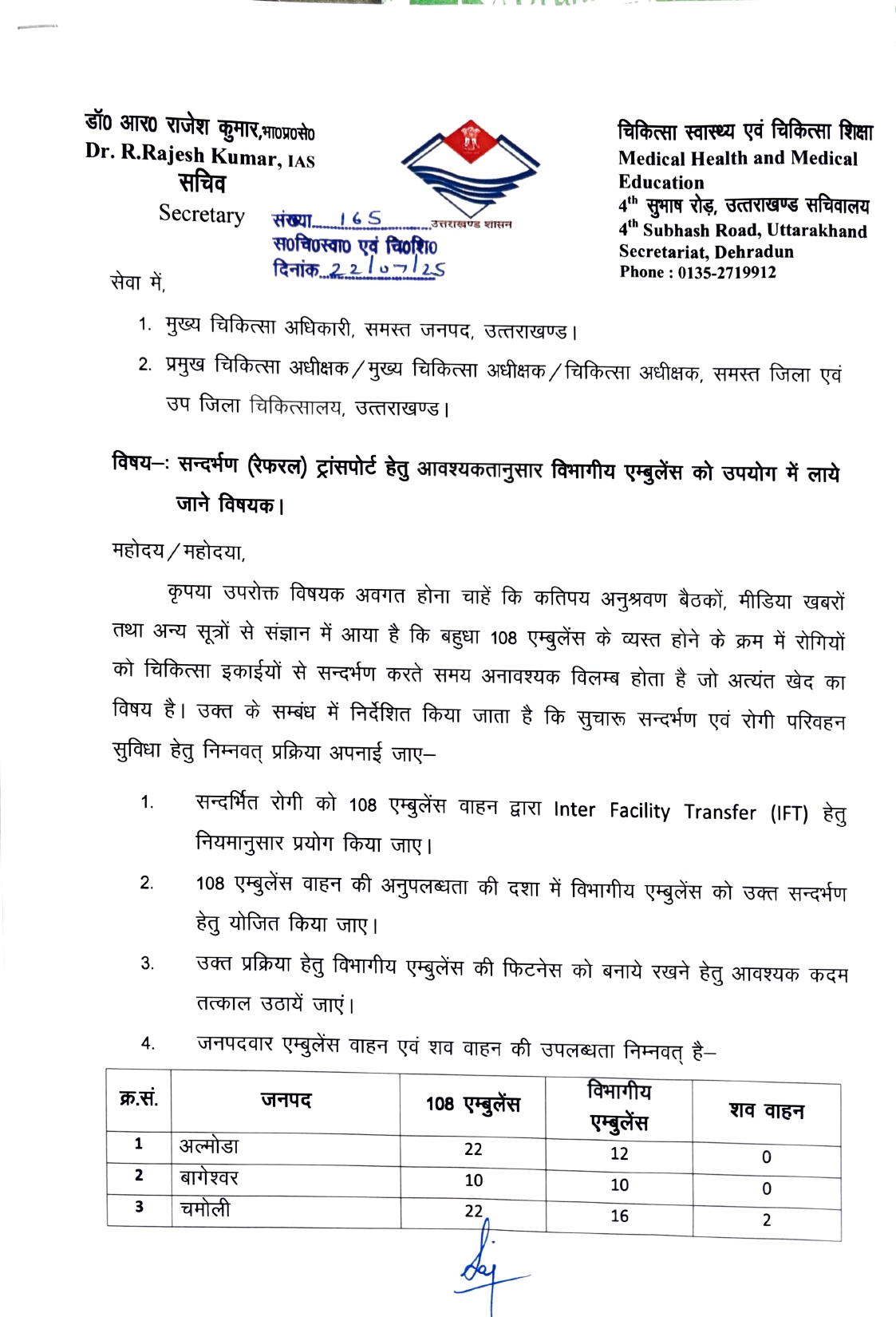 स्वास्थ्य सचिव डॉ. आर. राजेश कुमार ने बताया कि मुख्यमंत्री धामी के निर्देश अनुसार, रेफर मरीजों की आवाजाही में पारदर्शिता लाने के लिए एम्बुलेंस सेवाओं के उपयोग पर भी स्पष्ट गाइडलाइन जारी की गई है। 108 एम्बुलेंस का प्रयोग Inter Facility Transfer (IFT) के तहत ही हो। विभागीय एम्बुलेंस की तैनाती योजनाबद्ध ढंग से की जाए। सभी विभागीय एम्बुलेंस की तकनीकी स्थिति की समीक्षा कर फिटनेस सुनिश्चित की जाए।