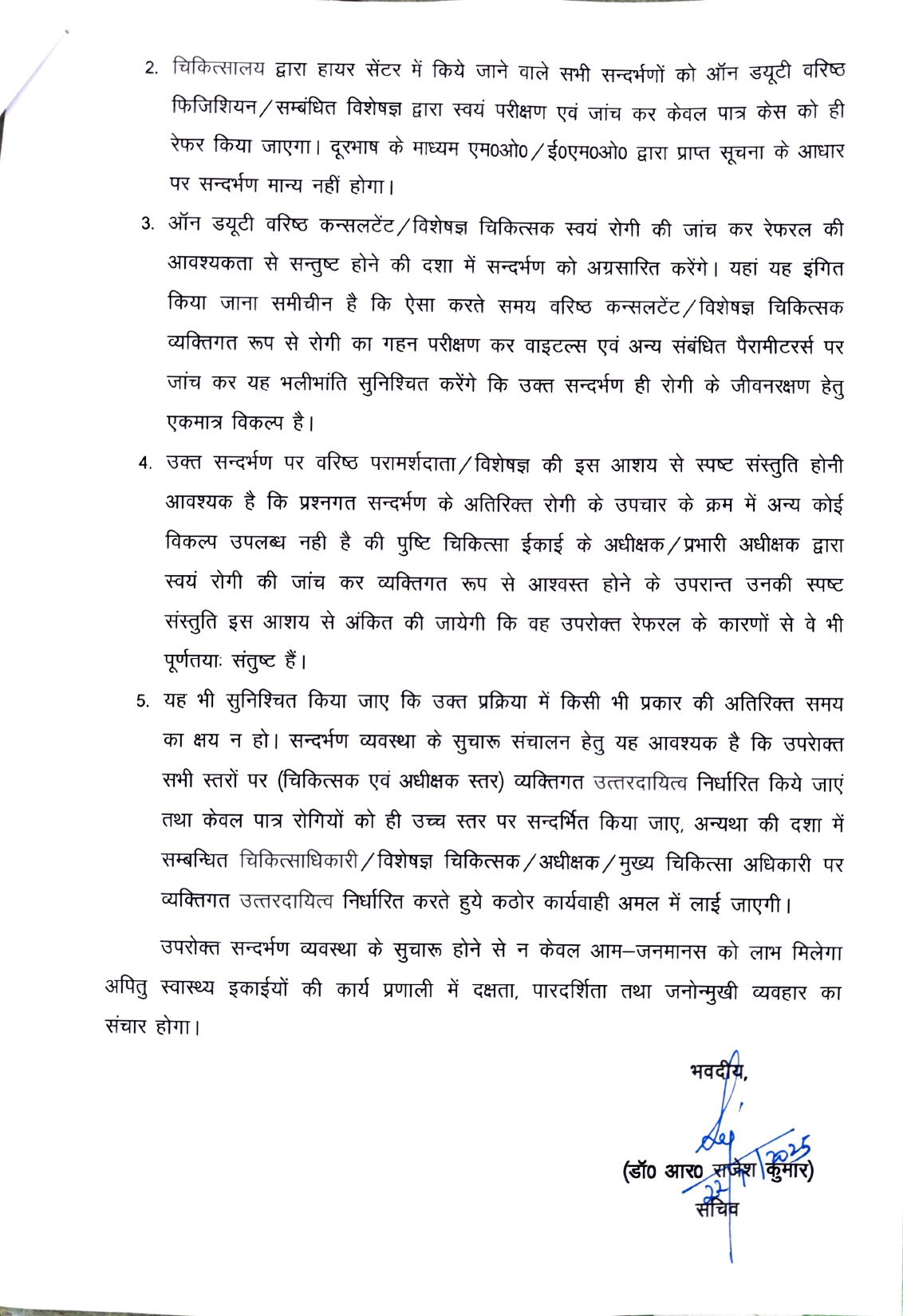 - वरिष्ठ अधिकारी होंगे जवाबदेह – अनुचित या गैर-जरूरी रेफरल पाए जाने पर संबंधित CMO या CMS को उत्तरदायी ठहराया जाएगा।