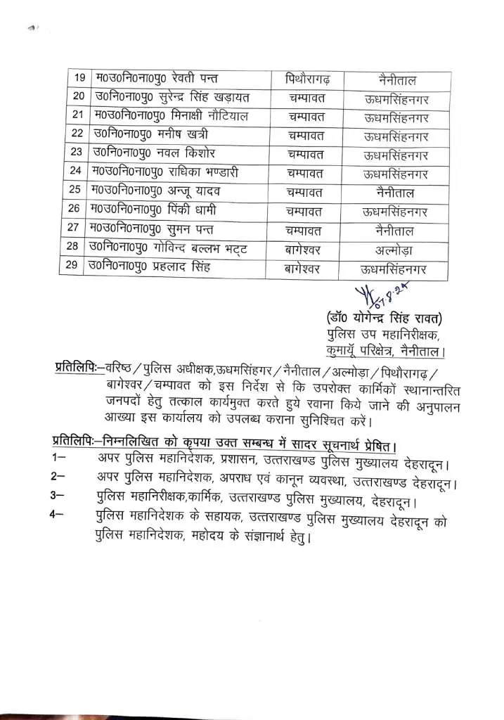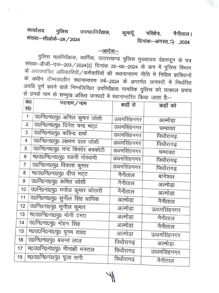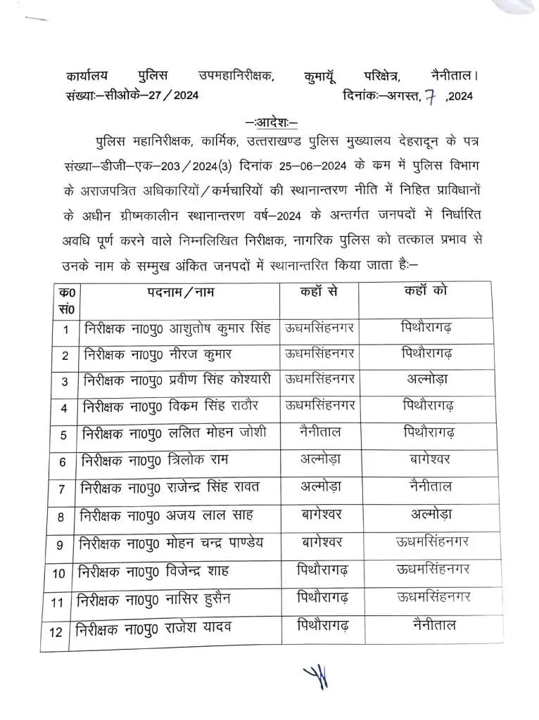 डीआईजी कुमाऊं ने किये इंस्पेक्टर और दरोगाओं के स्थानान्तरण, देखें सूचि