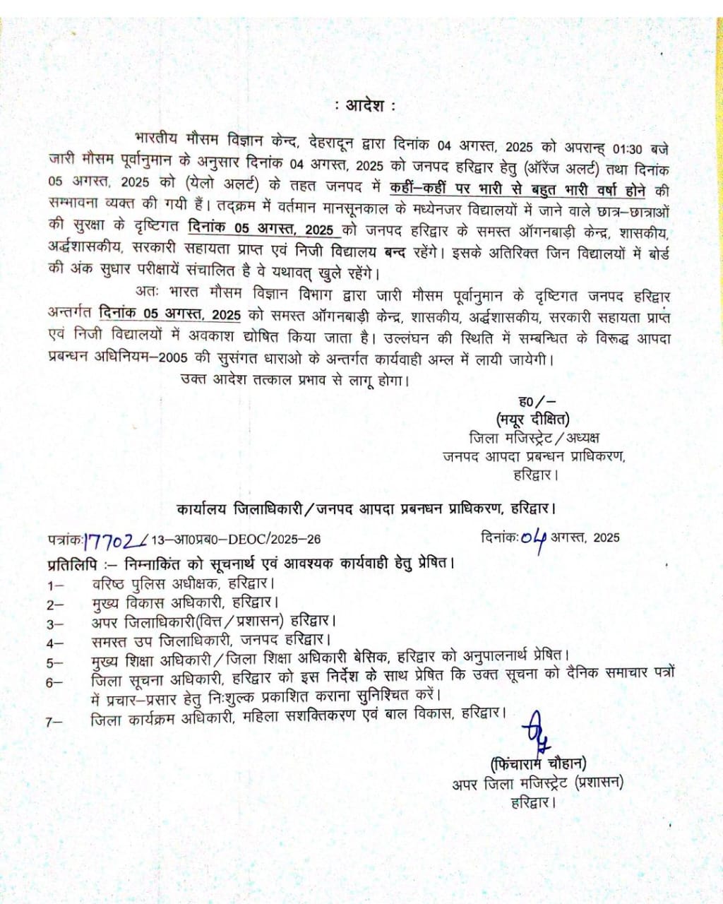 अतः भारत मौसम विज्ञान विभाग द्वारा जारी मौसम पूर्वानुमान के दृष्टिगत जनपद हरिद्वार अन्तर्गत दिनांक 05 अगस्त, 2025 को समस्त ऑगनबाड़ी केन्द्र, शासकीय, अर्द्धशासकीय, सरकारी सहायता प्राप्त एवं निजी विद्यालयों में अवकाश घोषित किया जाता है। उल्लंघन की स्थिति में सम्बन्धित के विरूद्ध आपदा प्रबन्धन अधिनियम-2005 की सुसंगत धाराओ के अन्तर्गत कार्यवाही अम्ल में लायी जायेगी। उन्होंने मुख्य शिक्षा अधिकारी तथा जिला कार्यक्रम अधिकारी को आदेश का सख्ती से अनुपालन सुनिश्चित कराने के निर्देश दिए।