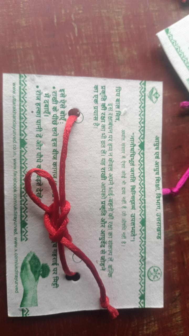 टिहरी : रक्षा बंधन के अवसर पर पर्यावरण संरक्षण को बढ़ावा देने के उद्देश्य से जिलाधिकारी टिहरी गढ़वाल नितिका खण्डेलवाल द्वारा आज नवाचारी पहल ‘सीड राखी’ का अनावरण किया गया। यह अनूठी पहल परंपरा और प्रकृति के संगम का प्रतीक है। आगामी रक्षाबंधन के उपलक्ष्य पर आयुष विभाग, टिहरी गढ़वाल की और से राखी वितरण कार्यक्रम का आयोजन किया गया।