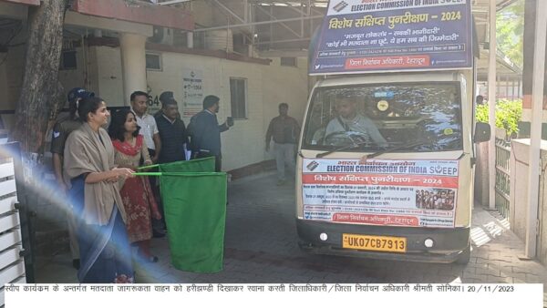 देहरादून : जिला निर्वाचन अधिकारी/जिलाधिकारी सोनिका द्वारा आज जिला कार्यालय कलेक्ट्रेट से स्वीप के कार्यक्रम के तहत मतदाता जागरूकता वाहन को हरीझण्डी दिखाकर रवाना किया। इस वाहन के माध्यम से जनपद कि विभिन्न विधानसभाओं में भ्रमण कर मतदाता जागरूकता कार्यक्रम के तहत मतदाताओं निर्वाचक नामावाली में जोड़ने, संशोधन, नाम हटाने तथा लोकतंत्र में मतदाताओं की भागीदारी के सम्बन्ध प्रचार-प्रसार किया जाएगा।