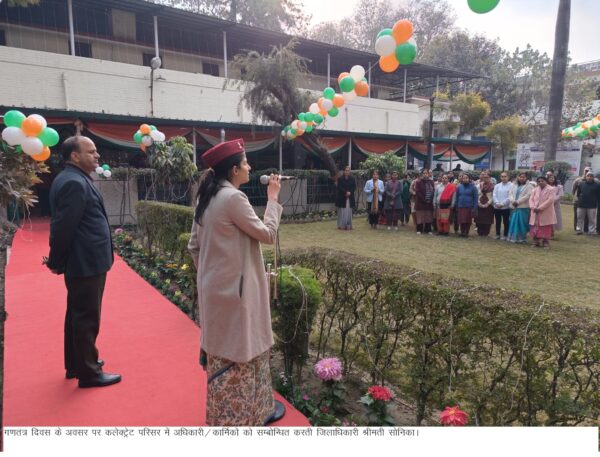 देहरादून : गणतंत्र दिवस के अवसर पर जिलाधिकारी सोनिका ने कलेक्ट्रेट परिसर में ध्वजारोहण किया। उन्होंने सभी को गणतंत्र दिवस की शुभकामनाएं दी। जिलाधिकारी ने अधिकारियों/कर्मचारियों को संबोधित करते हुए कहा कि हम जिस भी पद और पटल पर कार्यरत हों हमारा ध्येय यही होना चाहिए कि दायित्व पूर्ण जिम्मेदारी से निर्वहन करना है। जो भी फरियादी हमारे पास आए, उसकी समस्याओं को ध्यान से सुने, उसके निस्तारण में जो भी हमारे कार्य क्षेत्र में हमारे अधिकार है, उसका बखूबी प्रयोग करते हुए निस्तारण में हर संभव प्रयास किए जाएं।