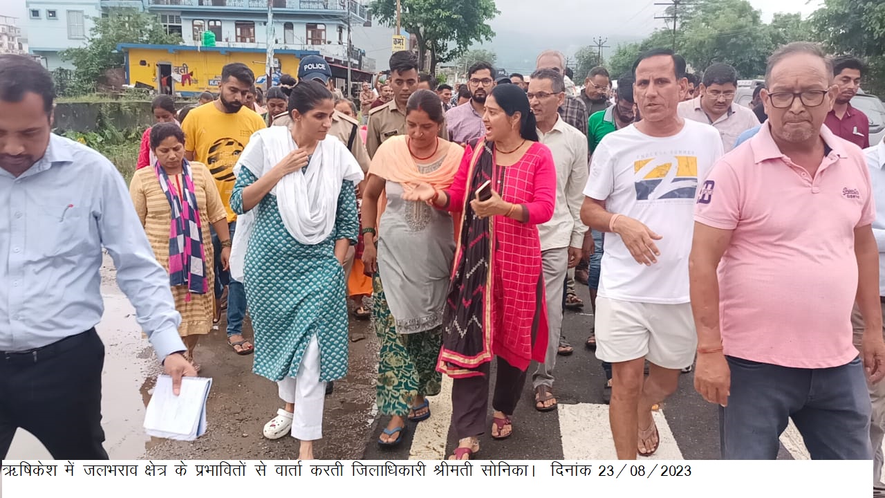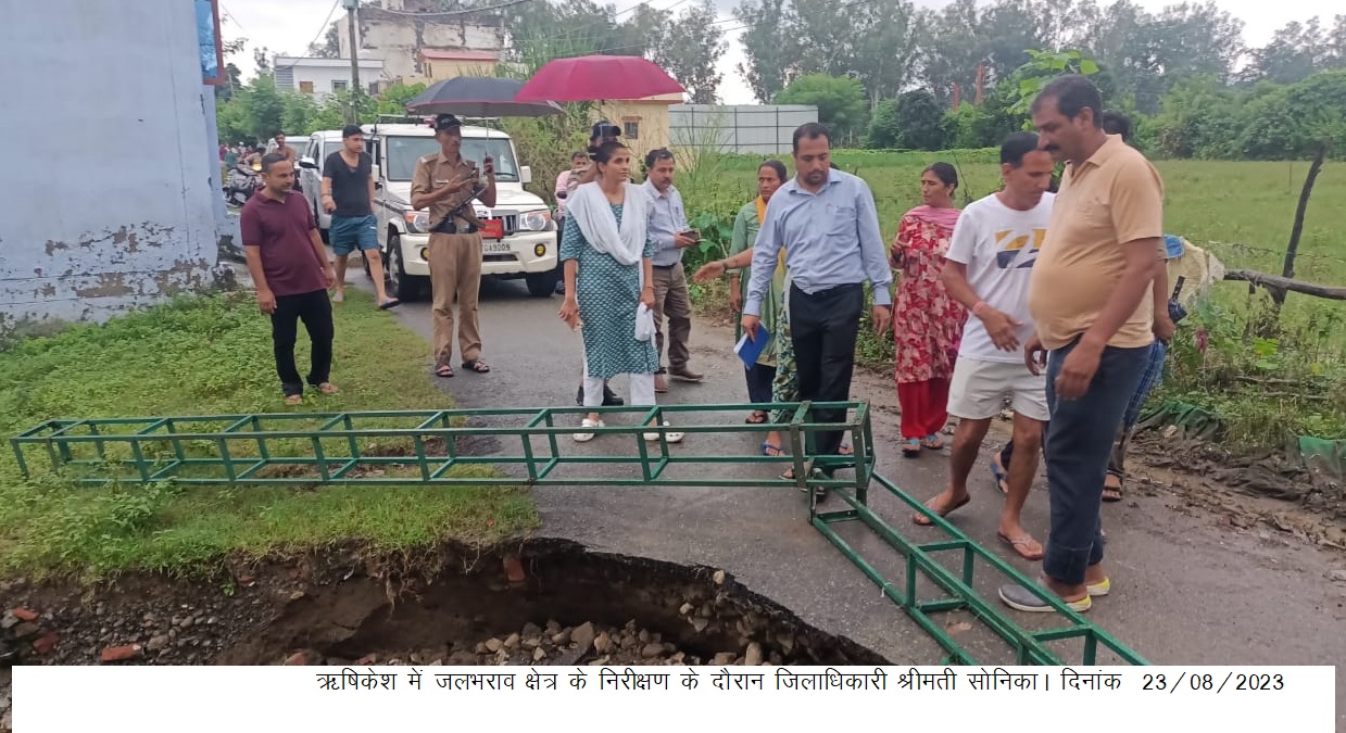 देहरादून : जिलाधिकारी सोनिका ने आज ऋषिकेश में जल भराव वाले क्षेत्र का निरीक्षण किया। निरीक्षण के दौरान जिलाधिकारी सोनिका ने संबंधित विभागों के अधिकारियों को पानी की निकासी करने के साथ ही कीटनाशकों का छिड़काव करने के निर्देश दिए। जिलाधिकारी सोनिका ने सम्बन्धित विभागों के अधिकारियों को निर्देश दिए कि युद्धस्तर पर राहत कार्य सम्पादित किये जाएं काार्यों में किसी प्रकार की लापरवाही न बरती जाए।