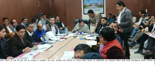देहरादून : राज्य सरकार के एक वर्ष पूर्ण होने पर प्रदेश स्तर पर 23 मार्च 2023 को  ‘ जन सेवा’ कार्यक्रम आयोजित किया जा रहा है। जनपद अवस्थित रेंजर्स ग्रांउण्ड में मुख्य कार्यक्रम आयोजित किए जाएंगे, जिसमें मुख्यमंत्री पुष्कर सिंह धामी प्रदेशवासियों को सम्बोधित करेंगे। जिलाधिकारी सोनिका ने जनपद में प्रस्तावित ‘जन सेवा’ कार्यक्रम को सफल बनाने हेतु एनआईसी सभागार कलेक्ट्रेट में  जिला स्तरीय अधिकारियों के साथ बैठक कर, कार्यक्रम स्थल पर बहुउद्देशीय शिविर लगाने हेतु आवश्यक दिशा-निर्देश दिए।