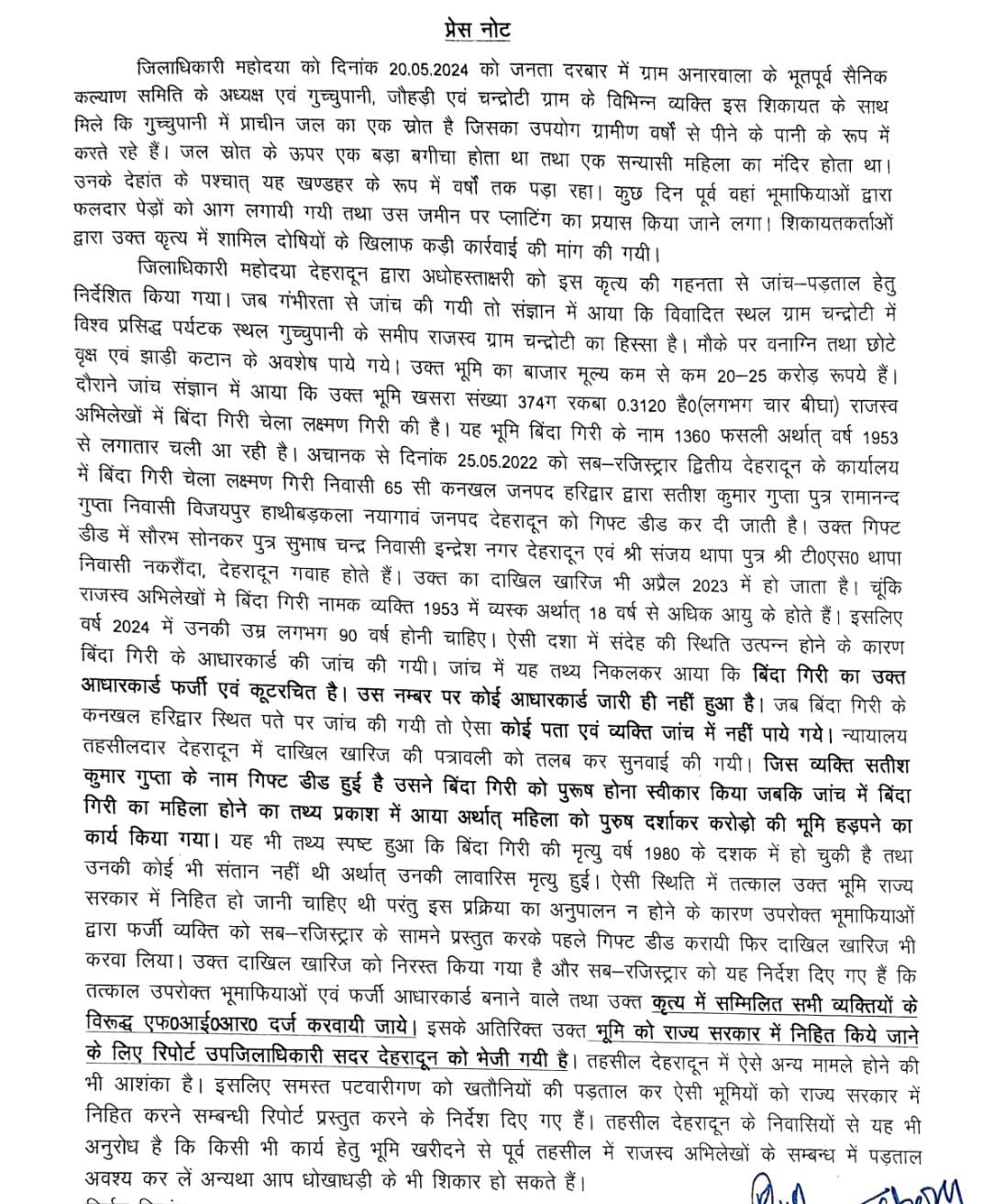 जिलाधिकारी द्वारा तहसीलदार सदर मोहम्मद शादाब को इस कृत्य की गहनता से जांच-पड़ताल हेतु निर्देशित किया गया। तहसीलदार सदर द्वारा इस प्रकरण की गंभीरता से जांच की गयी तो संज्ञान में आया कि विवादित स्थल ग्राम चन्द्रोटी में विश्व प्रसिद्ध पर्यटक स्थल गुच्चुपानी के समीप राजस्व ग्राम चन्द्रोटी का हिस्सा है। मौके पर वनाग्नि तथा छोटे वृक्ष एवं झाड़ी कटान के अवशेष पाये गये। उक्त भूमि का बाजार मूल्य कम से कम 20-25 करोड़ रूपये हैं। दौराने जांच संज्ञान में आया कि उक्त भूमि खसरा संख्या 374ग रकबा 0.3120 है0 (लगभग चार बीघा) राजस्व अभिलेखों में बिंदा गिरी चेला लक्ष्मण गिरी की है। यह भूमि बिंदा गिरी के नाम 1360 फसली अर्थात् वर्ष 1953 से लगातार चली आ रही है। अचानक से 25 मई 2022 को सब-रजिस्ट्रार द्वितीय देहरादून के कार्यालय में बिंदा गिरी चेला लक्ष्मण गिरी निवासी 65 सी कनखल जनपद हरिद्वार द्वारा सतीश कुमार गुप्ता पुत्र रामानन्द गुप्ता निवासी विजयपुर हाथीबड़कला नयागावं जनपद देहरादून को गिफ्ट डीड कर दी जाती है। उक्त गिफ्ट डीड में सौरभ सोनकर पुत्र सुभाष चन्द्र निवासी इन्द्रेश नगर देहरादून एवं संजय थापा पुत्र टीएस थापा निवासी नकरौंदा, देहरादून गवाह होते हैं। उक्त का दाखिल खारिज भी अप्रैल 2023 में हो जाता है।