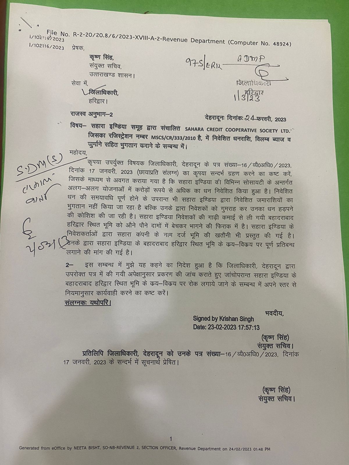 डीएम विनय शंकर पाण्डेय ने बहादराबाद स्थित सहारा समूह की भूमि विक्रय पर लगायी रोक
