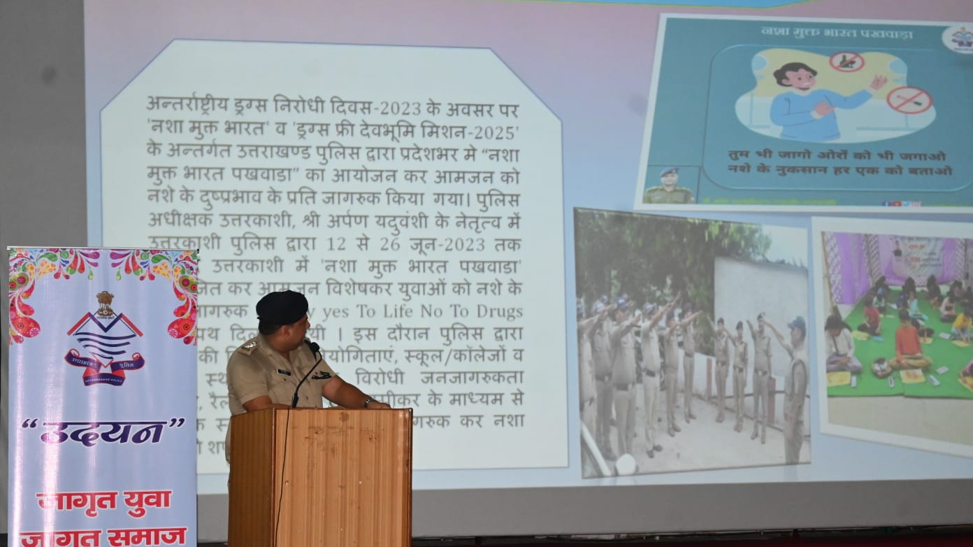 पुलिस उपाधीक्षक उत्तरकाशी अनुज कुमार के द्वारा कार्यक्रम मे सभी को नशे के दुष्प्रभावों की व्यापक जानकारी देते हुये पुलिस अधीक्षक उत्तरकाशी के निर्देशन में नशे के खिलाफ उत्तरकाशी पुलिस द्वारा की गई कार्रवाईयों की जानकारी दी गई। उनके द्वारा बताया गया कि पुलिस अधीक्षक के नेतृत्व में पुलिस द्वारा पिछले एक वर्ष मे NDPS Act में 32 अभियोग पंजीकृत कर 45 नशा तस्करों को जेल भेजा गया, जिसमें करीब 16.5 किग्रा0 चरस, 185 ग्राम स्मैक तथा 02 किग्रा0 अफीम बरामद की गई, वहीं नशे की जड़ पर प्रहार करतर हुये पुलिस द्वारा 400 नाली भू-भाग पर (09 हेक्टेयर) प्रतिबंधित अफीम व भांग की खेती नष्ट कर 22 भू-स्वामियों के विरुद्ध कार्यवाही की गई। नशे व अवैध मादक पदार्थों मे लगातार संलिप्त 16 लोगों पर गुण्डा एक्ट, 06 पर 110/109 (जी) तथा 01 के विरुद्ध गैंगस्टर की कार्रवाई की गयी। कार्यक्रम के अवसर पर पुलिस उपाधीक्षक(ऑप्स), प्रशान्त कुमार, प्रतिसार निरीक्षक जनक सिंह पंवार सहित अन्य विशिष्ट अतिथिगण पुलिस, आईटीबीपी, फायर, जिला प्रशासन के अधिकारी/कर्मगण, स्कूली छात्र/छात्राएं व एनसीसी कैडेट मौजूद रहे।