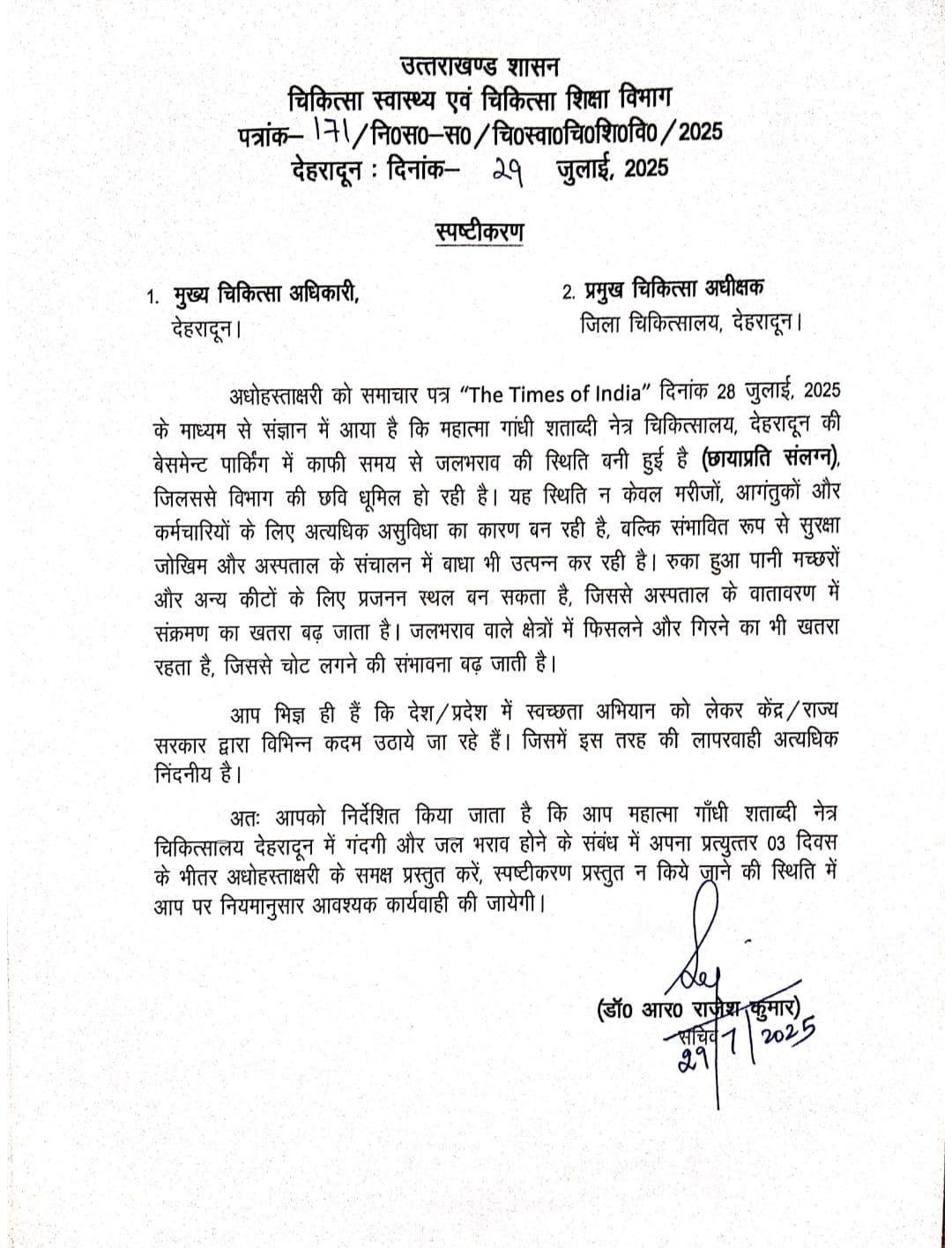 प्रकरण में देहरादून के मुख्य चिकित्सा अधिकारी और जिला चिकित्सालय के प्रमुख चिकित्सा अधीक्षक से भी तीन दिवस के भीतर लिखित स्पष्टीकरण मांगा गया है। स्वास्थ्य सचिव डॉ. आर. राजेश कुमार ने स्पष्ट किया है कि यदि समय सीमा के भीतर उत्तर प्राप्त नहीं हुआ, तो संबंधितों के विरुद्ध नियमानुसार कार्रवाई की जाएगी।