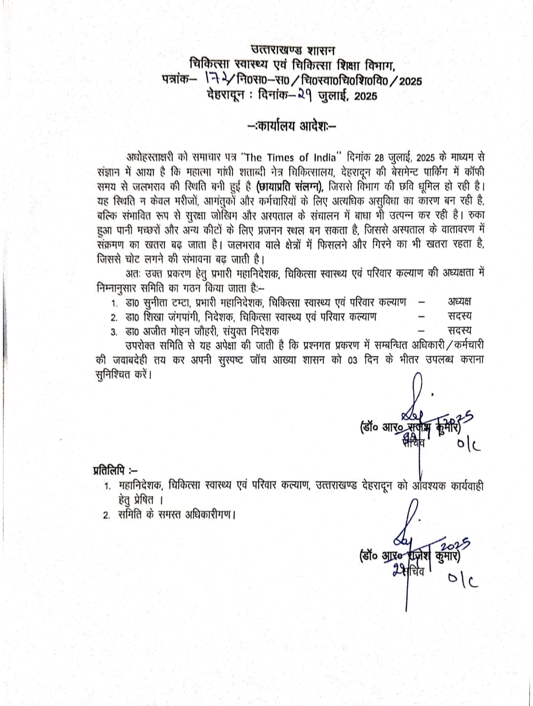 - जलभराव पर सचिव ने तीन सदस्यीय जांच समिति गठित कर तीन दिवस में रिपोर्ट तलब की