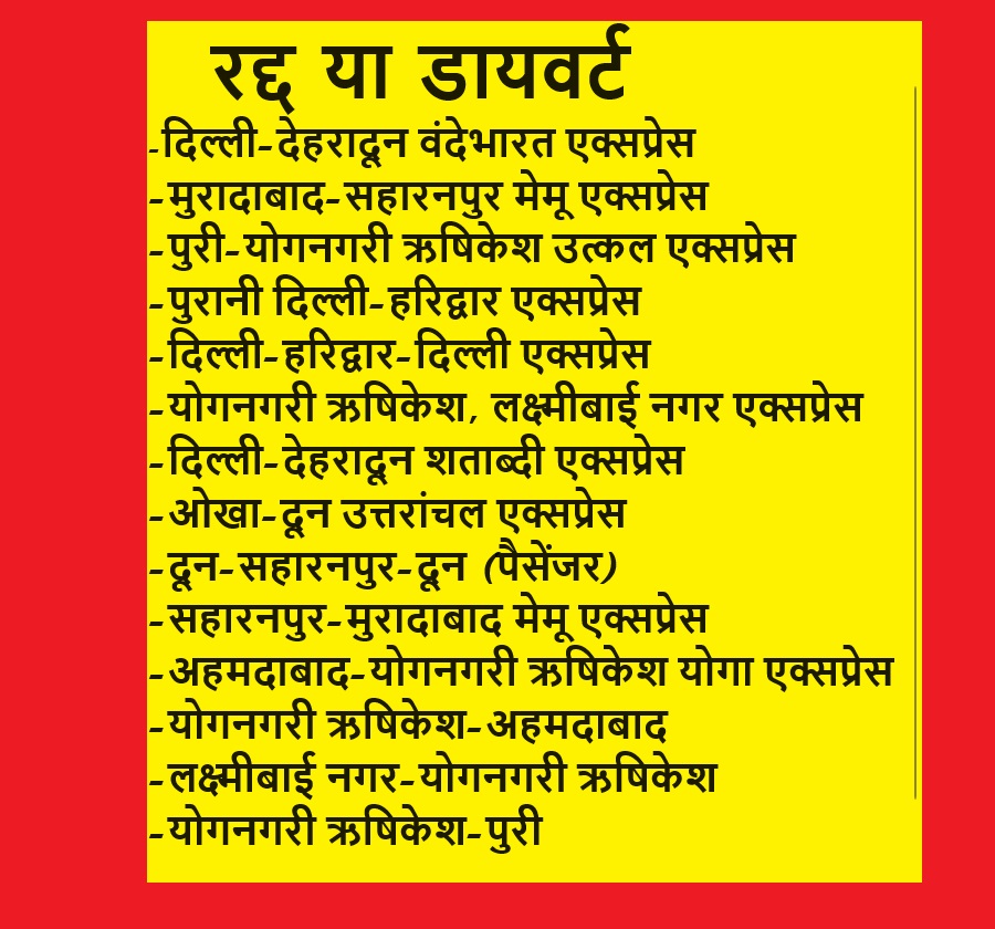देहरादून-सहारनपुर के बीच चलने वाली पैसेंजर ट्रेन 27 जून से रद्द चल रही है। उन्होंने बताया कि सोमवार से बुधवार तक दिल्ली-देहरादून बीच चलने वाली वंदे भारत एक्सप्रेस भी नहीं चलेगी। दिल्ली से देहरादून आने वाली शताब्दी एक्सप्रेस भी सोमवार से सहारनपुर तक आएगी और वहीं से वापस जाएगी।