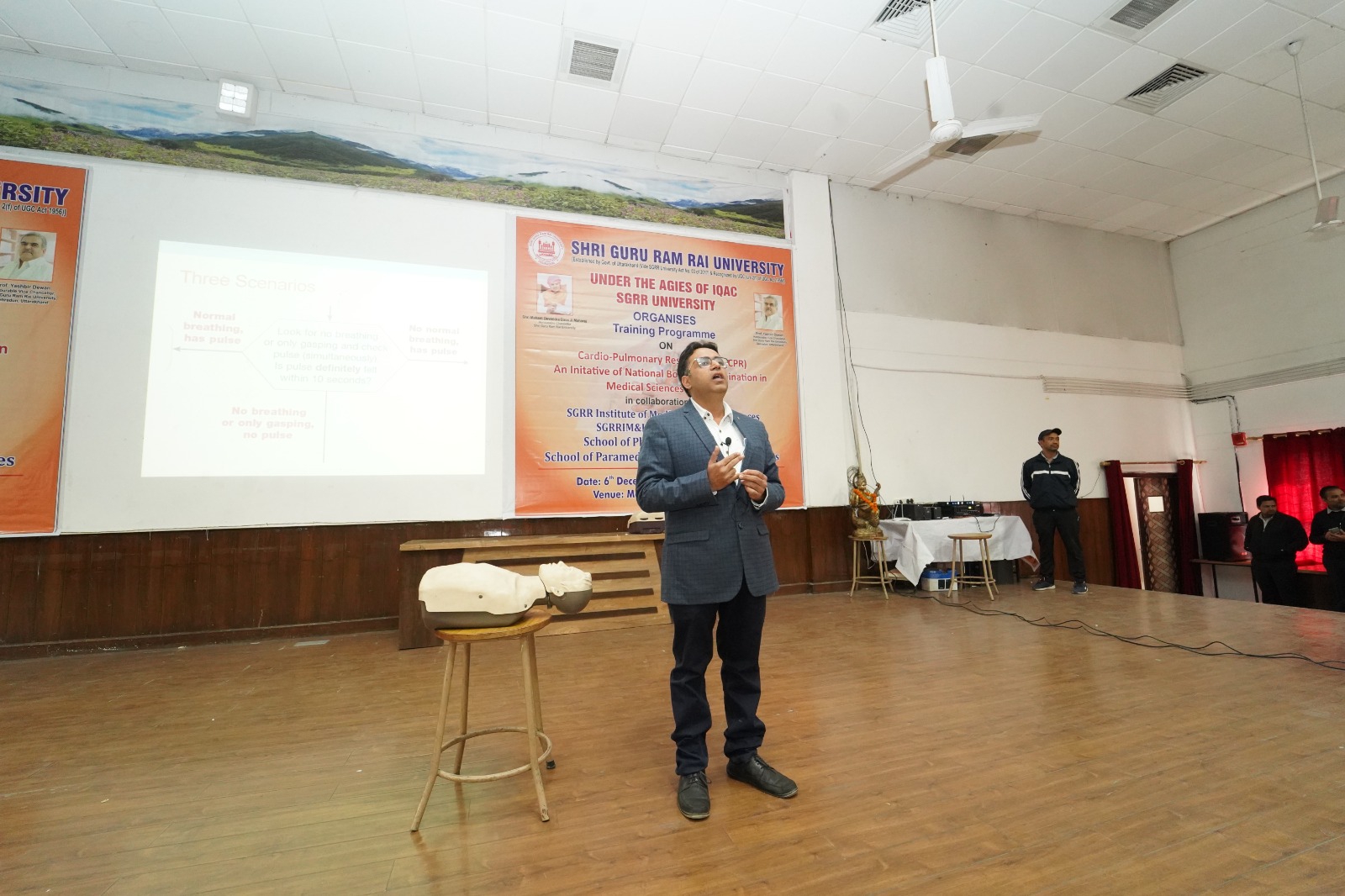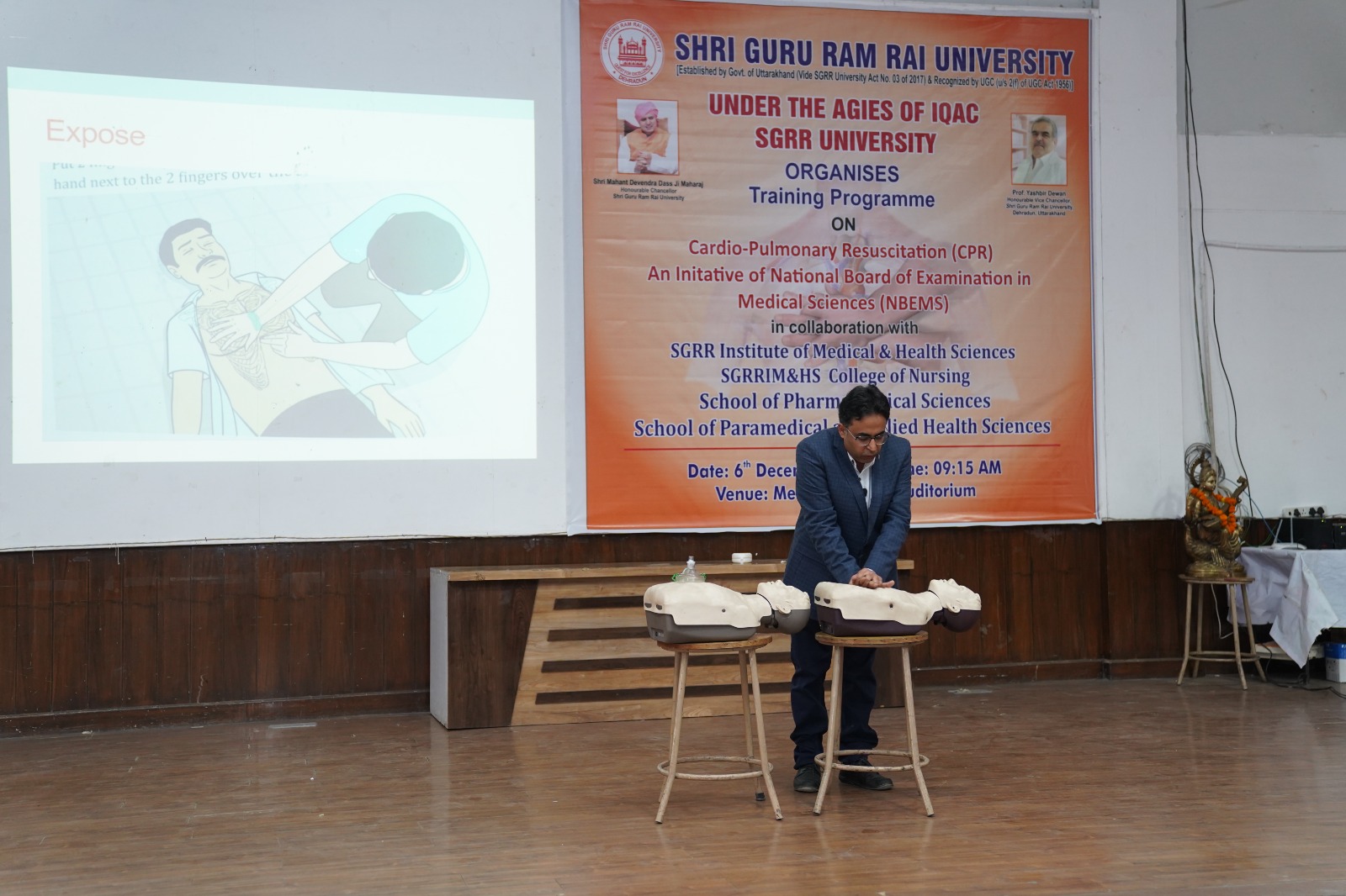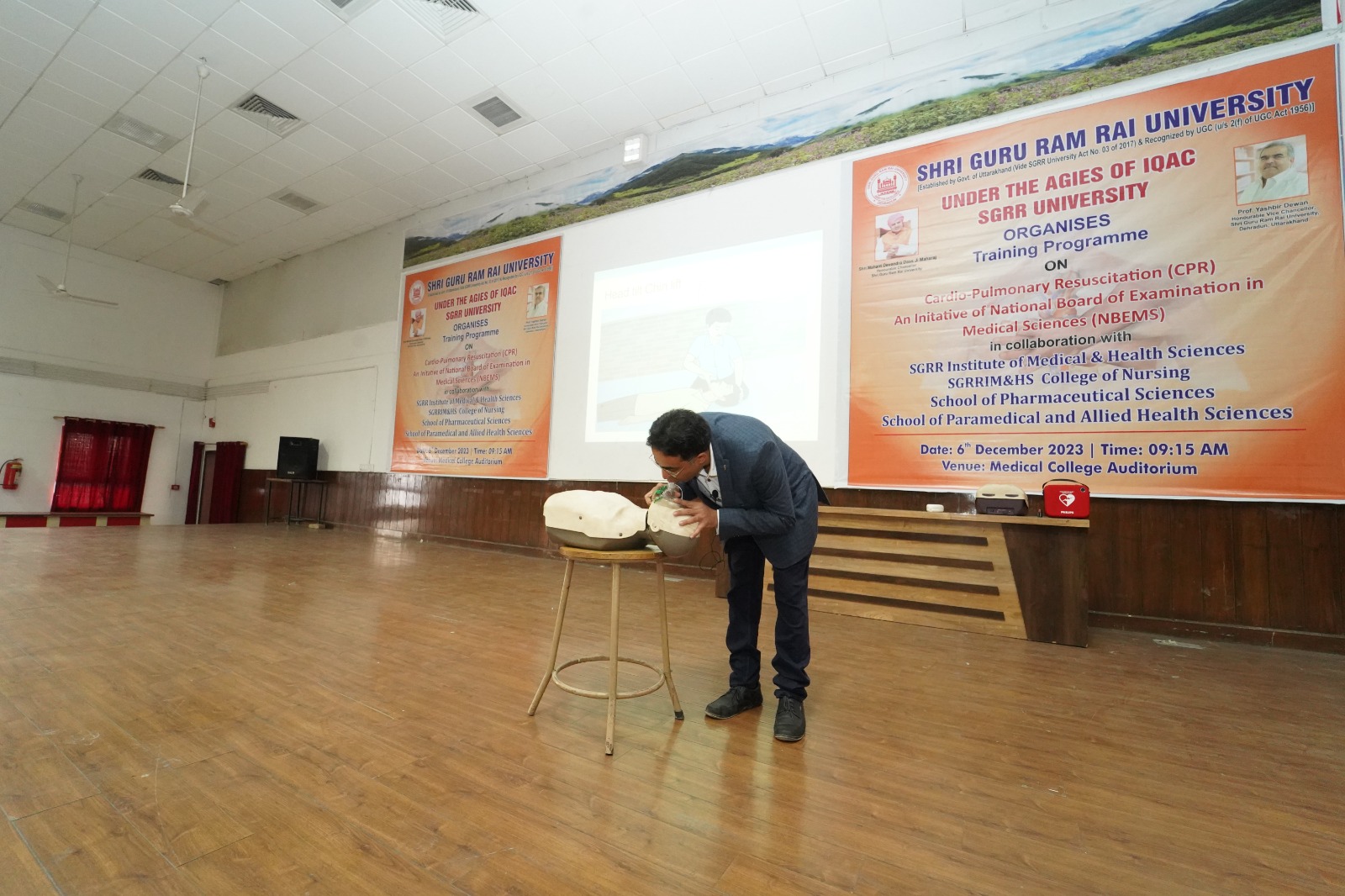 देहरादून। श्री गुरु राम राय विश्वविद्यालय (एसजीआरआरयू) में नैशनल बोर्ड ऑफ इग्जैमिनेशन इन मैडिकल साइंसेज के सहयोग व विश्वविद्यालय के आई.क्यू.ए.सी. सैल, स्कूल ऑफ मेडिकल, काॅलेज ऑफ नर्सिग, स्कूल ऑफ फार्मास्यूटिकल साइंसेज और स्कूल ऑफ पैरामैडिकल एण्ड एलाइड हैल्थ साइंसेज ने कार्डियोपल्मोनरी रिसससाईटेशन(सी.पी.आर.) के महत्व को उजागर करने हेतु सेमिनार का आयोजन किया। इस सेमिनार में विश्वविद्यालय के सभी 11 स्कूलो के 1,200 से भी अधिक छात्र-छात्राओं ने उत्साहपूर्वक प्रतिभाग किया। कार्यक्रम का शुभारंभ एनेस्थीसिया के विभागाध्यक्ष डाॅ. निशिथ गोविल और डाॅ. कुमार पराग द्वारा संयुक्त रूप से किया गया।