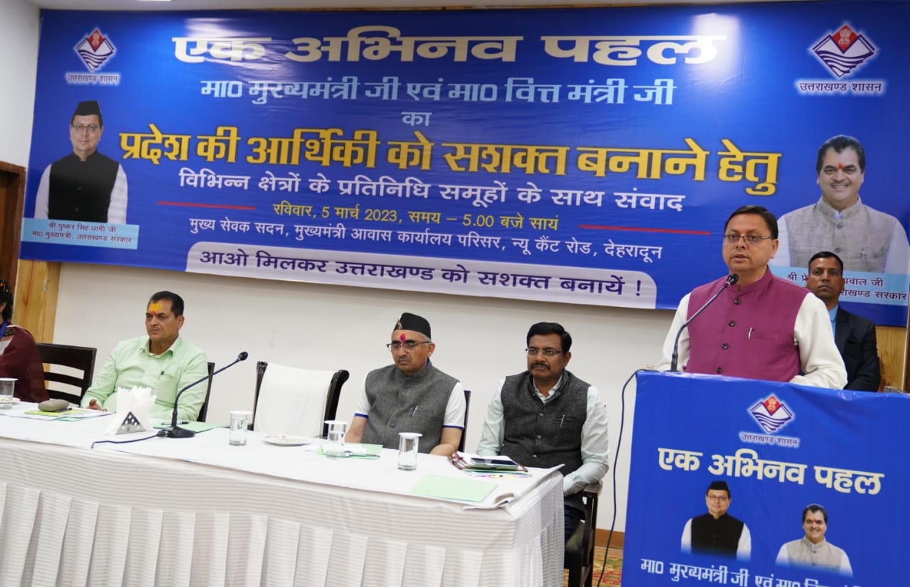 देहरादून : मुख्यमंत्री पुष्कर सिंह धामी ने रविवार को मुख्यमंत्री आवास स्थित मुख्य सेवक सदन में प्रदेश की आर्थिकी को सशक्त बनाने के लिये कृषि, बागवानी, उद्योग, व्यापार आदि समूह के प्रतिनिधियों से संवाद कर उनके सुझाव एवं विचारों से अवगत हुए। मुख्यमंत्री ने कहा कि हम सबको मिलकर उत्तराखण्ड को सशक्त राज्य बनाने का संकल्प लेना होगा। उन्होंने कहा कि इस संवाद से प्राप्त होने वाले सुझावों को आगामी बजट में समावेश करने के प्रयास किये जायेंगे। सुझाव देने वालों को अपने अपने क्षेत्रों की क्रीम बताते हुए मुख्यमंत्री ने कहा कि इससे 21 वीं सदी के तीसरे दशक को उत्तराखण्ड का दशक बनाने में भी निश्चित रूप से मदद मिलेगी। प्रदेश के विकास में जन सहभागिता को जरूरी बताते हुए मुख्यमंत्री ने कहा कि सरकारी क्षेत्र में रोजगार के अवसर सीमित हैं इसलिये हमें स्वरोजगार के माध्यम से रोजगार देने को आंदोलन बनाना होगा। समस्याओं एवं सुझावों का भी हमें मिलकर समाधान ढूंढना है। हमारा प्रयास अंत्योदय की अवधारणा को सर्व स्पर्शी विकास के साथ पूर्ण करने का है। यही हमारा मूल मंत्र भी है।