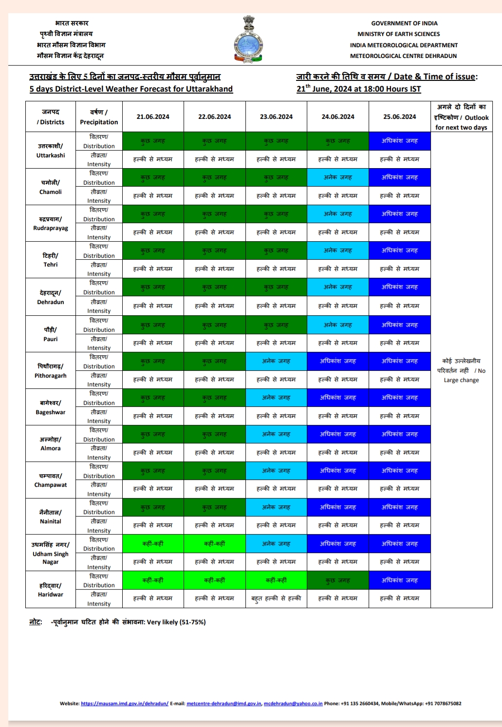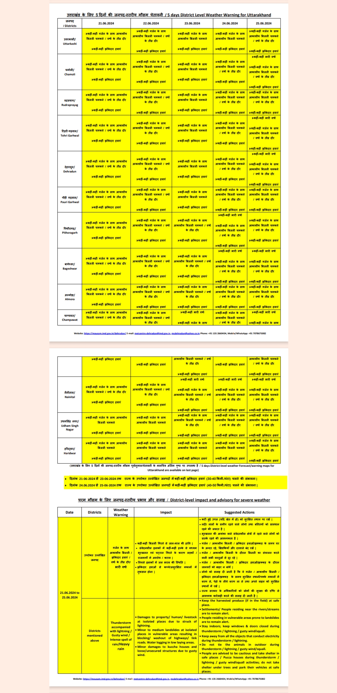राजधानी देहरादून से लेकर पहाड़ के लगभग सभी जिलों में रुक-रुक कर बारिश का सिलसिला जारी है। इस बीच मौसम विभाग ने अलर्ट जारी किया है। मौसम विभाग के अनुसार 21 जून से लेकर 25 जून तक प्रदेश के लगभग सभी जिलों में बारिश का सिलसिला लगातार जारी रहने का अनुमान लगाया गया है।