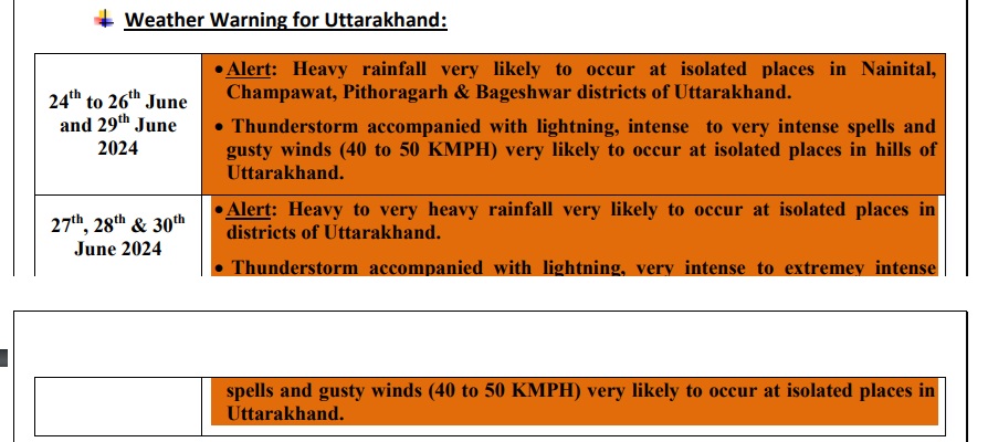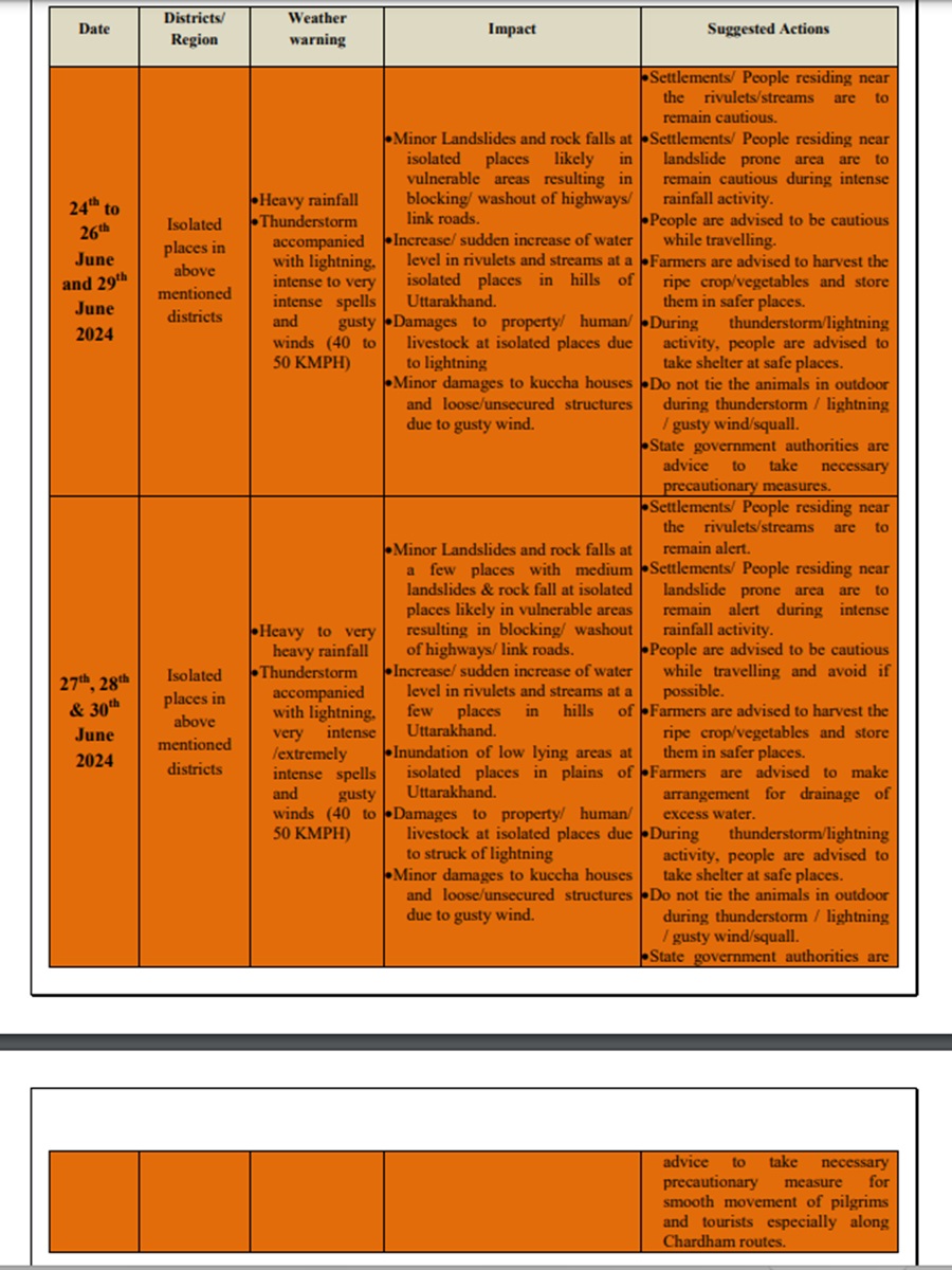 देहरादून : मानसून आने वाला है। मौसम विभाग ने 24 से 30 जून तक भारी से भारी बारिश का ऑरेंज अलर्ट जारी किया है। मौसम विभाग ने सतर्कता बरतने को कहा है। ख़ाससतौर पर चारधाम यात्रा पर निकले तीर्थयात्रियों को अतिरिक्त सतर्कता बरतने की सलाह दी गई है। मौसम विभाग महानिदेशक बिक्रम सिंह ने बताया कि अगले सप्ताह 27, 28 और 30 जून को प्रदेश के अधिकांश जिलों में भारी से भारी बारिश का ऑरेंज अलर्ट किया गया है। इस दौरान पहाड़ों पर कहीं हल्का तो कहीं भारी भूस्खलन होने की आशंका है। इससे रास्ते भी प्रभावित हो सकते हैं। ऐसे में खासतौर पर चारधाम यात्रा पर जाने वाले तीर्थयात्रियों को पूर्वानुमान के अनुसार सतर्कता बरतने की सलाह दी गई है। कहीं-कहीं पर नदियों में जलस्तर बढ़ने एवं रास्तों आदि में जलभराव से नुकसान होने की आशंका है। 24 जून से 26 जून तक और 29 जून को कुमाऊं मंडल के चार जिलों नैनीताल, चंपावत, पिथौरागढ़ और बागेश्वर जिले में भारी बारिश का ऑरेंज अलर्ट किया गया है। अगले तीन-चार दिनों में मानसून उत्तर प्रदेश में पहुँच जाएगा और उसके बाद उत्तराखंड में प्रवेश करेगा।