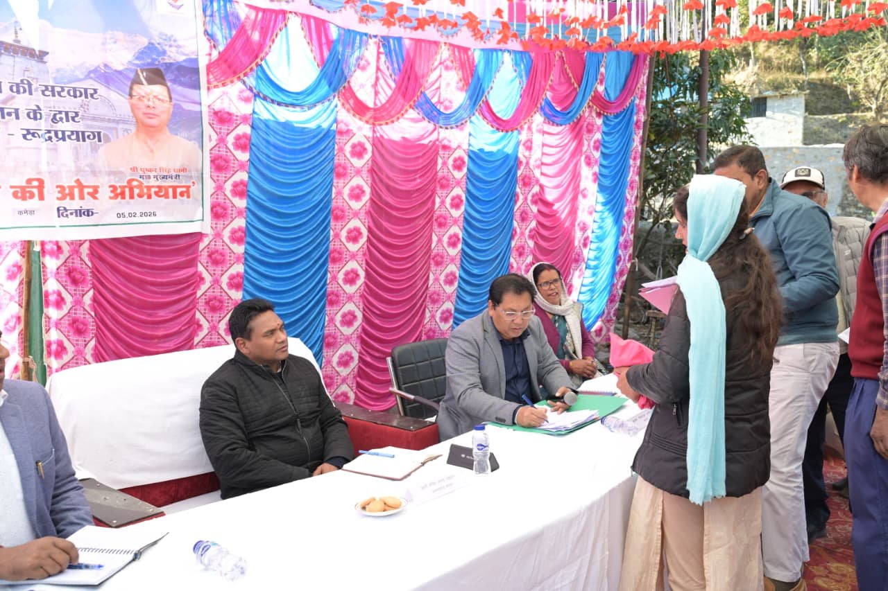 रुद्रप्रयाग : मुख्यमंत्री पुष्कर सिंह धामी के दिशा-निर्देशों के क्रम में आम जनमानस तक केंद्र एवं राज्य सरकार की जनकल्याणकारी योजनाओं का लाभ सीधे पहुंचाने और जनसमस्याओं के त्वरित समाधान के उद्देश्य से प्रदेशभर में “जन-जन की सरकार, जन-जन के द्वार” अभियान संचालित किया जा रहा है। इसी क्रम में प्रभारी सचिव रुद्रप्रयाग डॉ. आर. राजेश कुमार ने जनपद का दौरा कर प्रशासनिक व्यवस्थाओं का स्थलीय निरीक्षण किया और ग्रामीणों से सीधा संवाद स्थापित किया। जिलाधिकारी रुद्रप्रयाग प्रतीक जैन के कुशल नेतृत्व में जनपद की 27 न्याय पंचायतों में चरणबद्ध रूप से बहुउद्देशीय शिविरों का आयोजन किया जा रहा है। इसी कड़ी में 05 फरवरी 2026 को न्याय पंचायत सतेराखाल के अंतर्गत ग्राम कमेड़ा में “प्रशासन गांव की ओर” बहुउद्देशीय शिविर का आयोजन किया गया। शिविर की अध्यक्षता प्रभारी सचिव रुद्रप्रयाग डॉ. आर. राजेश कुमार ने की।