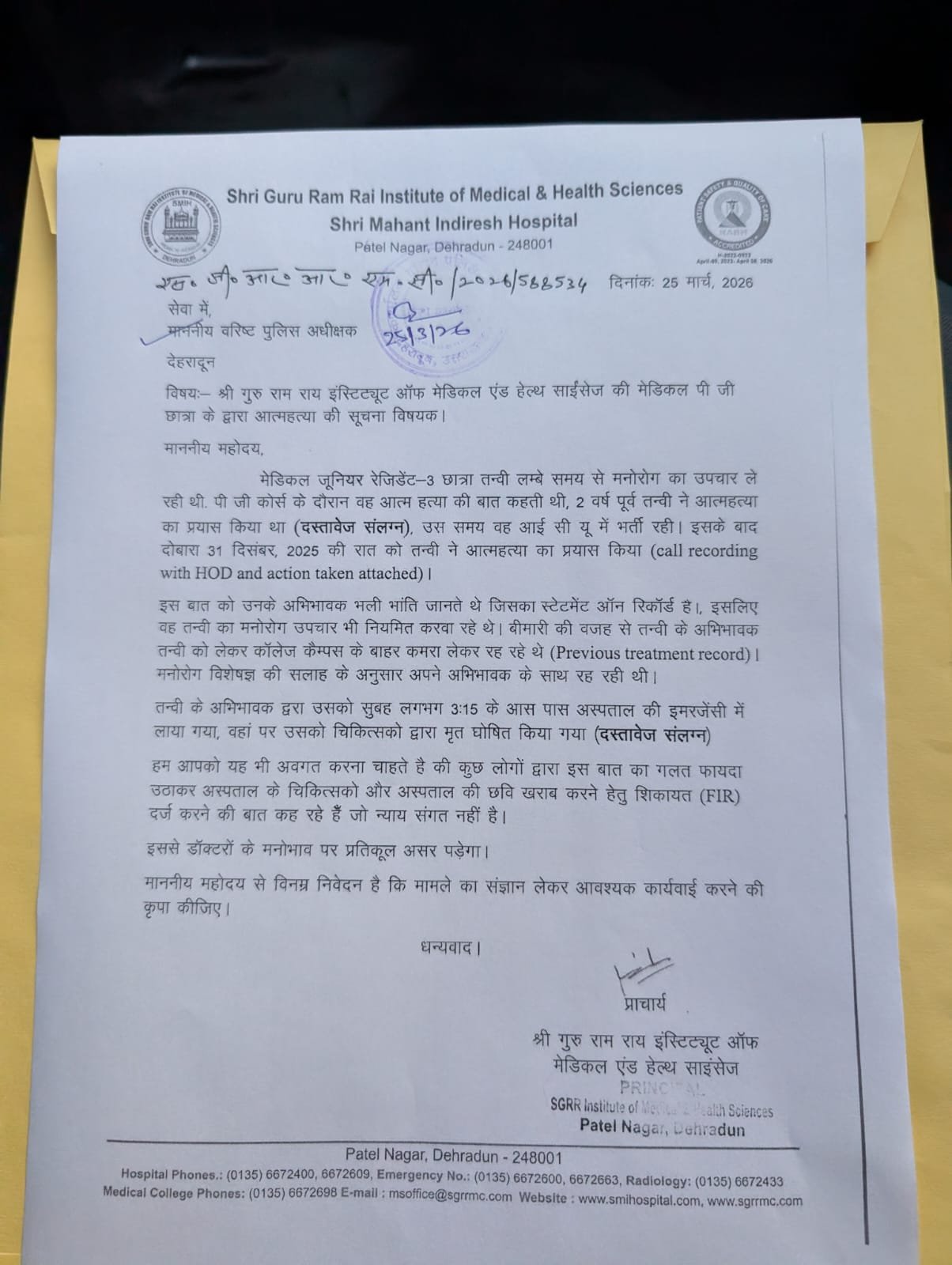 इस मामले पर एस जी आर आर मेडिकल कॉलेज ने वरिष्ठ पुलिस अधीक्षक देहरादून को पत्र लिखकर पूरे घटनाक्रम से अवगत करवाया है. एस जी आर आर मेडिकल कॉलेज ने डॉक्टर तन्वी के मनोरोग उपचार के आवश्यक दस्तावेज और मेडिकल रिपोर्ट भी लगाकर दी हैँ.