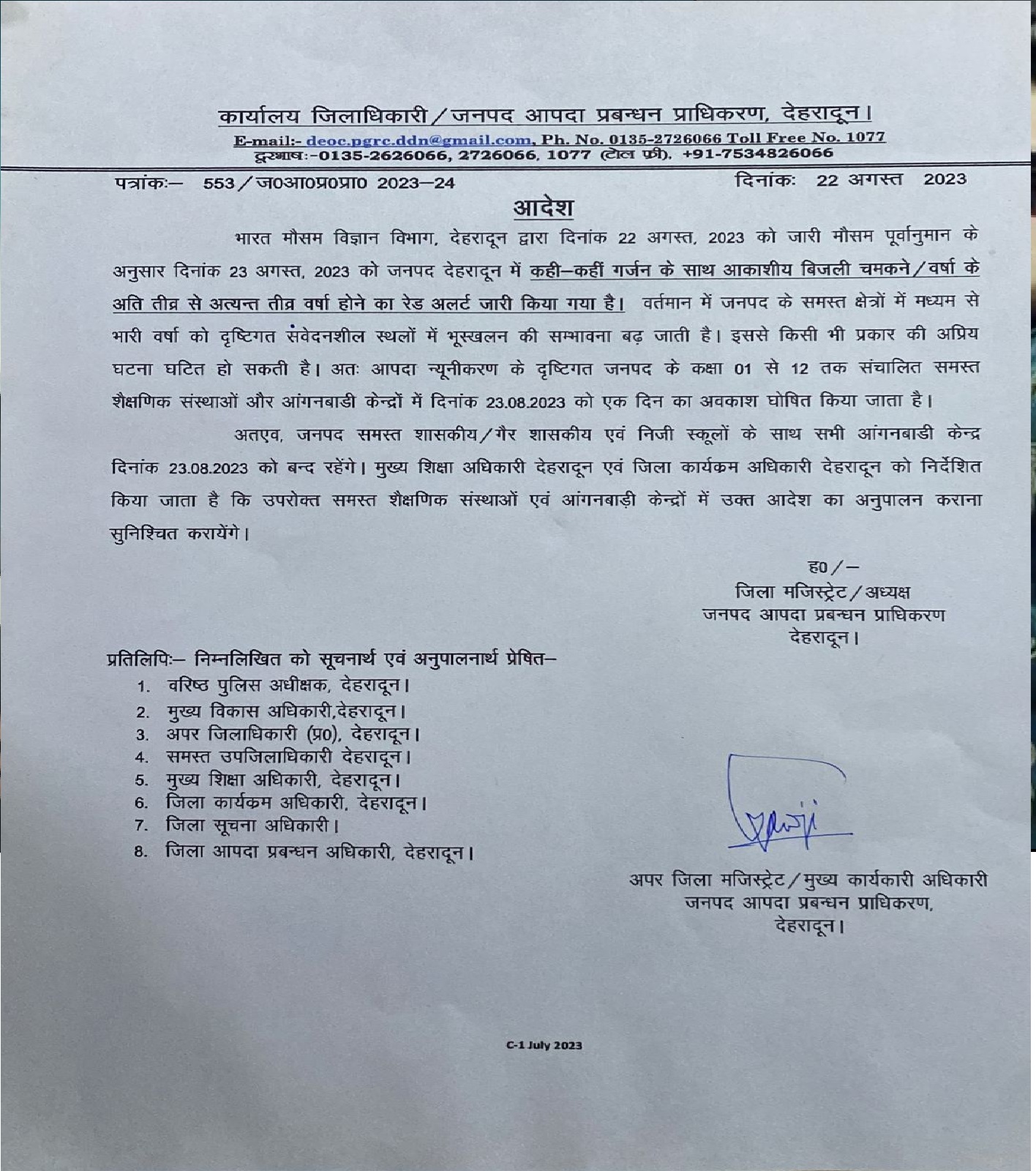 मौसम विभाग के अलर्ट को देखते हुए देहरादून समेत कुछ अन्य जिलों में भी स्कूलों की छुट्टियां घोषित कर दी गई हैं। मौसम विभाग के अनुसार देहरादून में भारी बारिश हो सकती है। इसके अलावा कहीं-कहीं आकाशी बिजली चमकने और अति से अत्यन्त भारी बारिश होने की चेतानी भी जारी की गई है। वर्तमान में जनपद के समस्त क्षेत्रों में मध्यम भारी वर्षाको दृष्टिगत संवेदनशील स्थलों में भूस्खलन की सम्भावना बढ जाती है। इससे किसी भी प्रकार को अप्रिय घटना घटित हो सकती है। आपदा न्यूनीकरण के दृष्टिगत जनपद के कक्षा 01 से 12 तक संचालित समस्त शैक्षणिक संस्थाओं और अंगनवाडी केन्द्रों में 23 अगस्त को एक दिन का अवकाश घोषित किया जाता है।