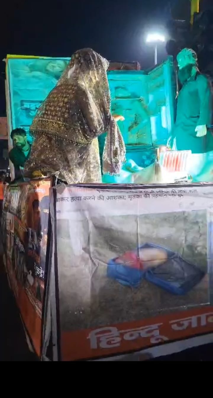 शोभा यात्रा में प्रदर्शित इस विशेष झांकी का मुख्य विषय था ‘लव जिहाद का कातिल आशियाना’। इस थीम के तहत पोस्टरों और नारों के जरिए युवतियों को इस गंभीर खतरे के प्रति सचेत करने का प्रयास किया गया। झांकी में स्पष्ट रूप से दर्शाया गया कि किस तरह सुनियोजित ढंग से बालिकाओं और युवतियों को प्रेम जाल में फंसाकर उनके जीवन को बर्बाद किया जाता है। यह झांकी एक दृश्य माध्यम से समाज को यह संदेश दे रही थी कि ‘लव जिहाद’ केवल एक व्यक्तिगत घटना नहीं, बल्कि एक गहरी साजिश है।