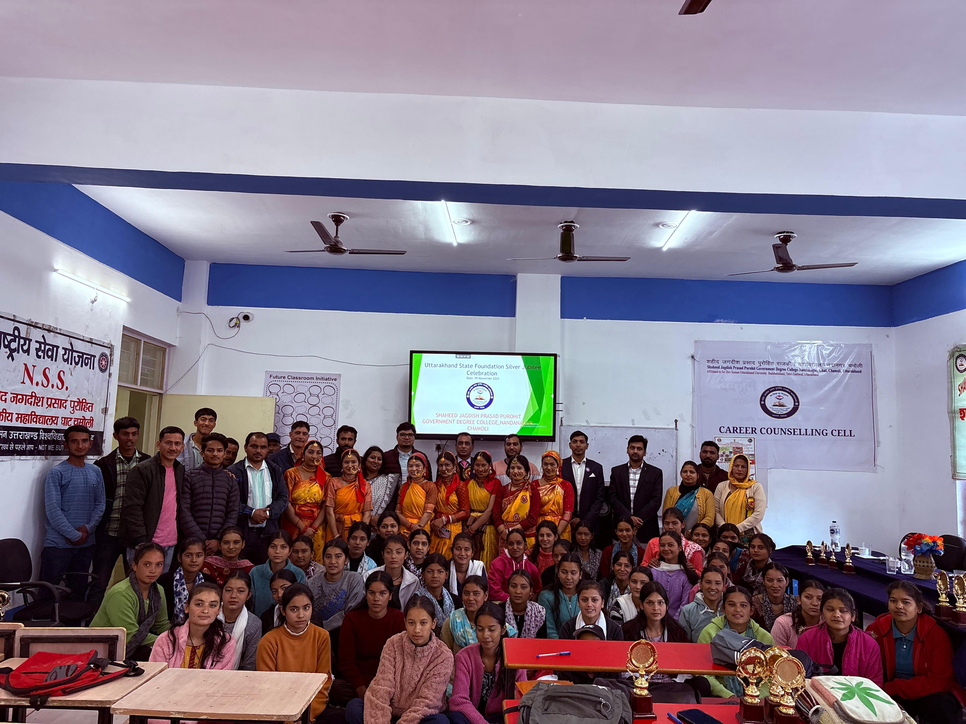 नंदानगर : शहीद जगदीश प्रसाद पुरोहित राजकीय महाविद्यालय नंदानगर में उत्तराखण्ड स्थापना रजत जयंती के अंतर्गत कार्यक्रम का आयोजन किया गया । उत्तराखंड राज्य स्थापना की रजत जयंती के उपलक्ष्य में शहीद जगदीश प्रसाद पुरोहित राजकीय महाविद्यालय नंदानगर में विविध कार्यक्रमों का आयोजन किया गया। समारोह में महाविद्यालय के छात्र-छात्राओं ने उत्साहपूर्वक भाग लिया। कार्यक्रम की अध्यक्षता नव नियुक्त प्राचार्य प्रो. विद्या शंकर शर्मा ने की, जबकि विशिष्ट अतिथि मीना देवी और मुख्य अतिथि आशीष देवराड़ी रहे। कार्यक्रम की रूपरेखा कार्यक्रम अधिकारी डॉ. आशु रौलेट द्वारा तय की गई। दीप प्रज्वलन के साथ समारोह का शुभारंभ किया गया।