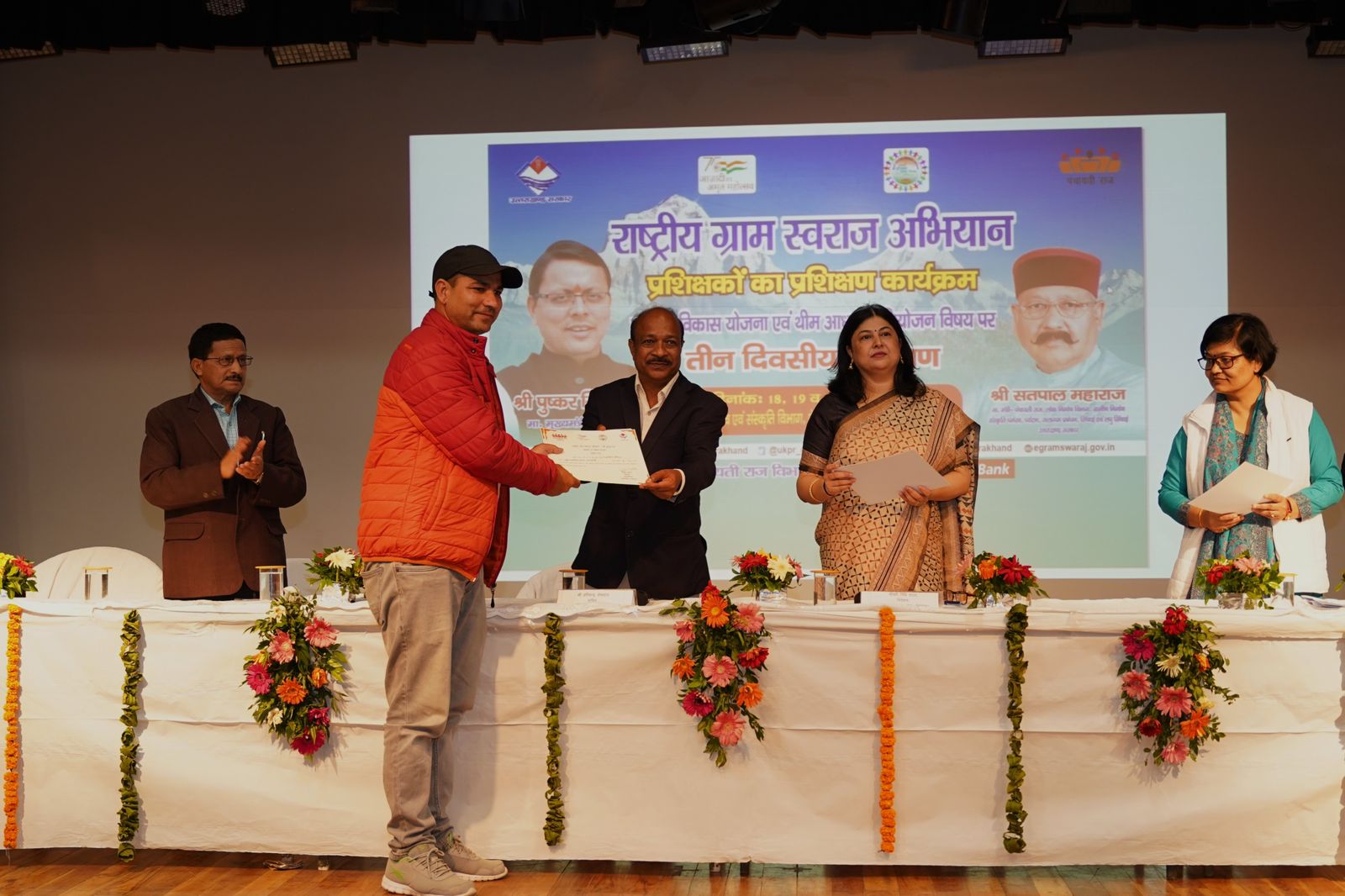 डॉक्टर हरपाल सिंह नेगी गांव घेस, ब्लॉक देवाल, चमोली, जड़ी बूटी उत्पादन के मॉडल विकास प्रक्रिया पर बात की। विभिन्न थीम पर समूह चर्चा और फीडबैक के बाद प्रतिभागियों का मूल्यांकन टेस्ट भी लिया गया जिसके परिणामों की घोषणा कुछ समय पश्चात की जायेगी । इसके बाद प्रतिभागियों को सचिव हरिचंद सेमवाल और निदेशक पंचायती राज निधि यादव द्वारा प्रमाण पत्र देकर केंद्र और राज्य सरकार द्वारा संचालित योजनाओं को जन जन तक पहुंचाने और योजनाओं के वास्तविक क्रियान्वयन में पंचायत प्रतिनिधियों की क्षमतावृद्धि अनिवार्य है और उसके लिए मास्टर ट्रेनर्स को पूरी लगन और निष्ठा से अपना दायित्व निर्वहन करना होगा ।
